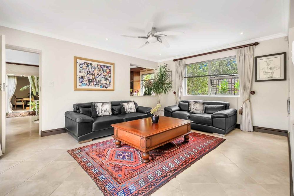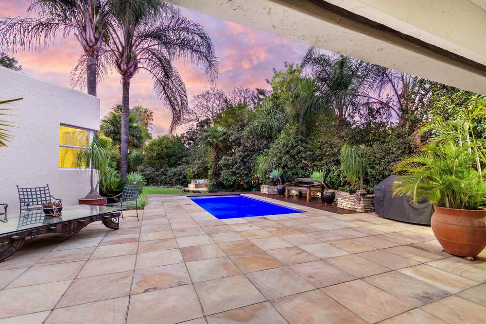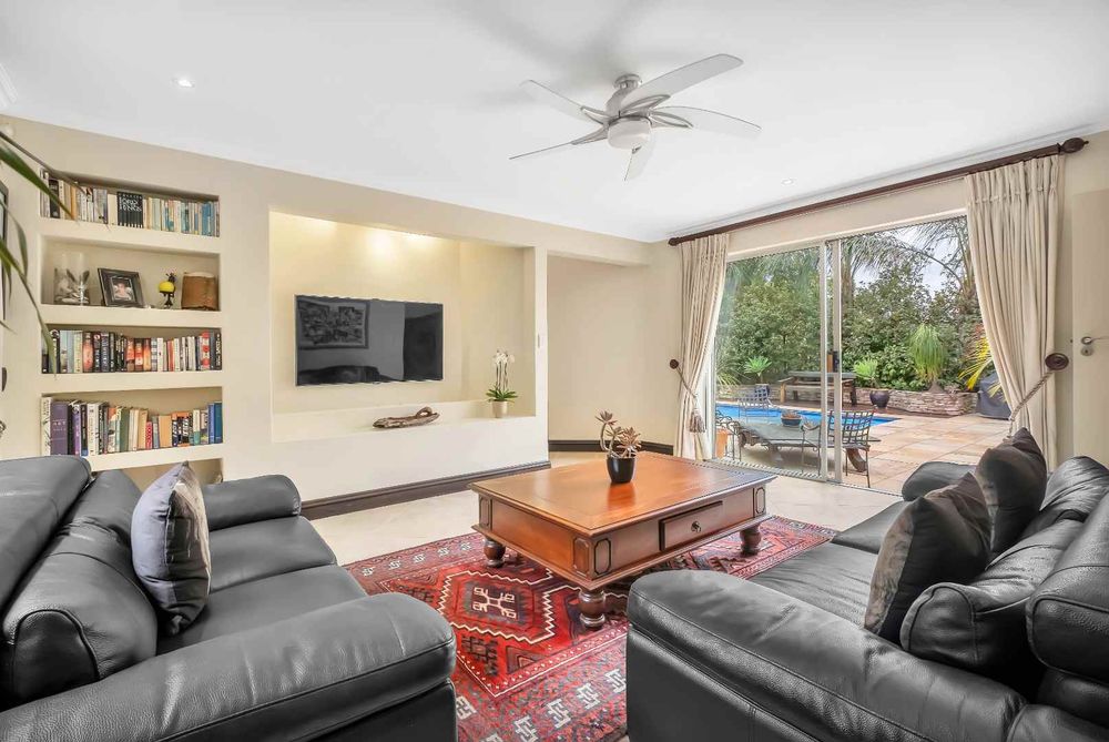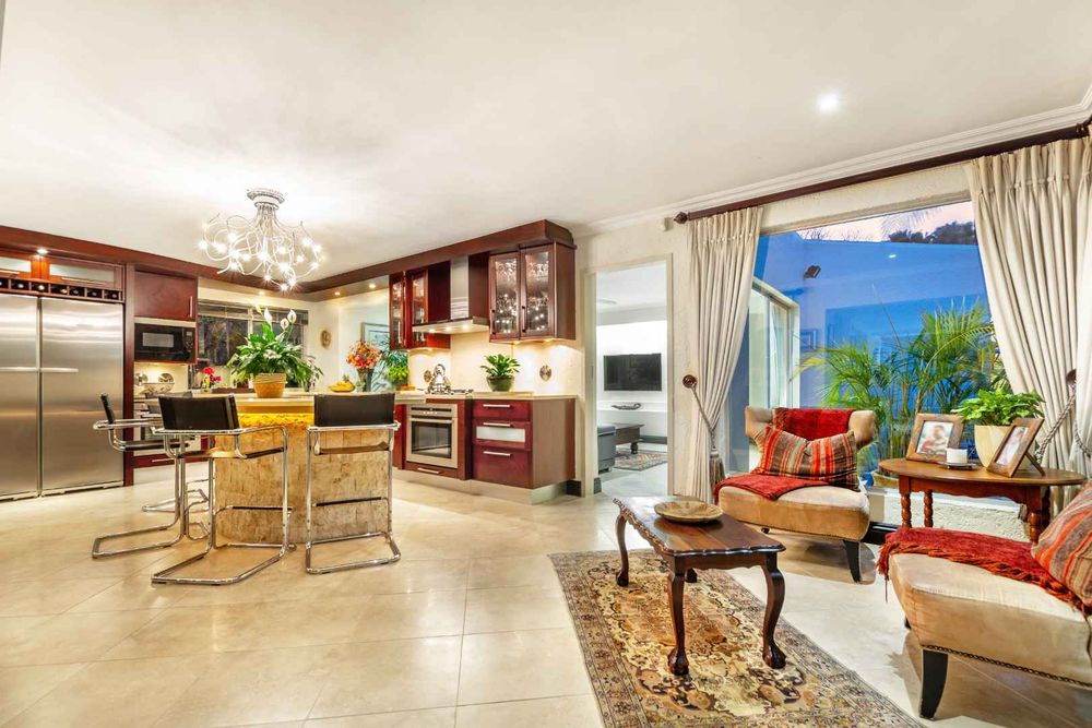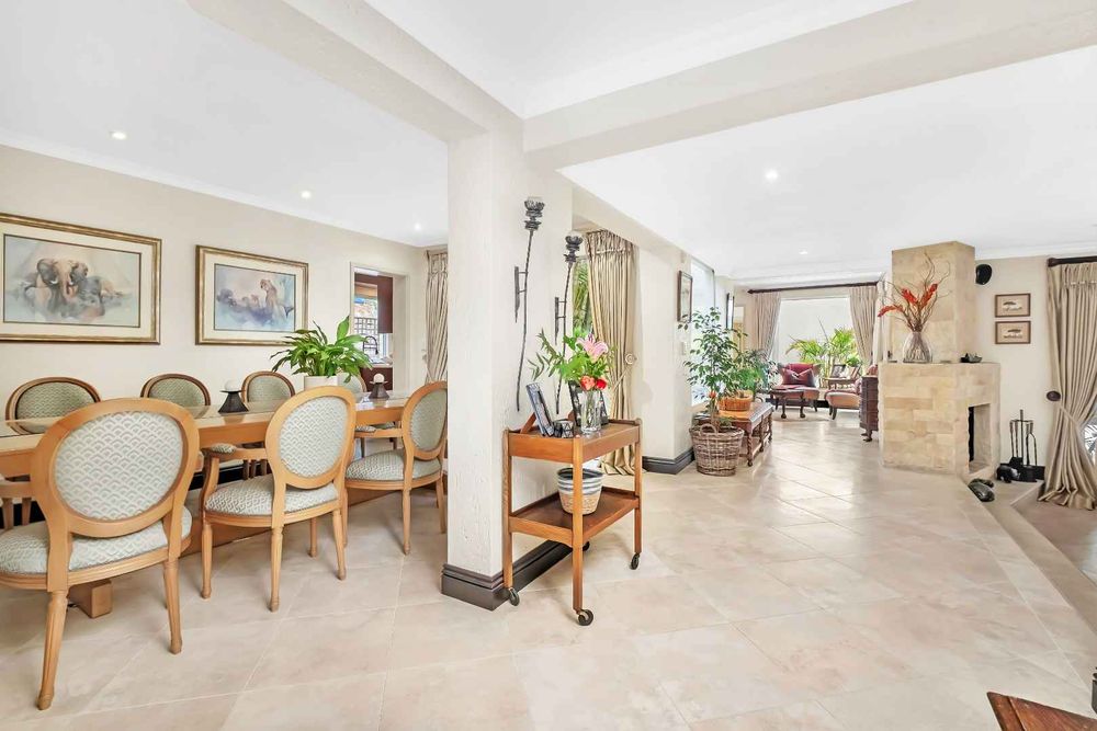 The formal lounge flows onto the covered patio and there is a gas fireplace for winter evenings. The dining room looks onto an open atrium with stunning bamboo plants, creating additional light and drama. The family room and dining room connect to the kitchen and the kitchen offers so many features! The beautiful breakfast bar island is ideal for prepping and there is a gas/electric oven and hob with extractor. The small sink has a ZIP hydro-tap that provides instant boiling water or ice cold water and there is a second eye-level oven. The cupboards are a rosewood wrap with light stone counter tops. The scullery is very spacious and this kitchen can fit multiple fridges and appliances. The staff room has been converted into a utility room and the bathroom is still accessed from outside.