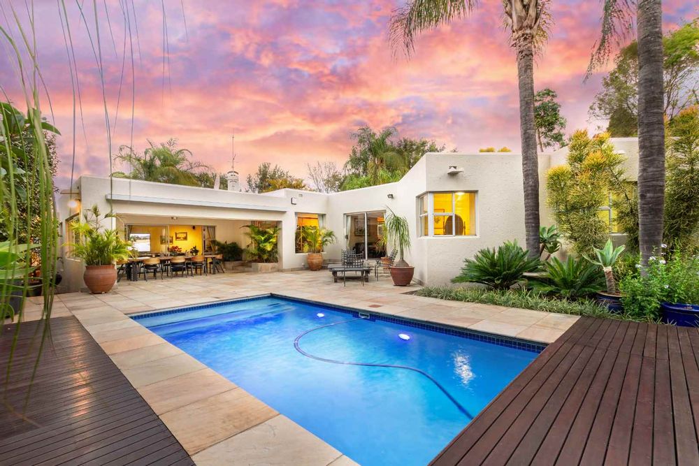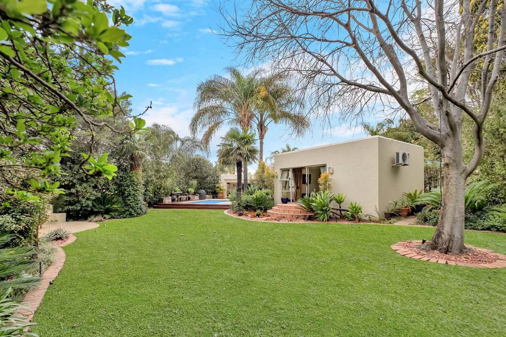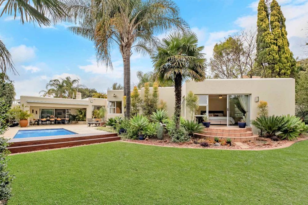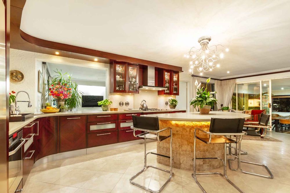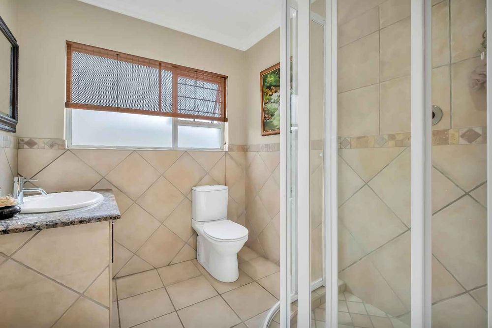 The formal lounge flows onto the covered patio and there is a gas fireplace for winter evenings. The dining room looks onto an open atrium with stunning bamboo plants, creating additional light and drama. The family room and dining room connect to the kitchen and the kitchen offers so many features! The beautiful breakfast bar island is ideal for prepping and there is a gas/electric oven and hob with extractor. The small sink has a ZIP hydro-tap that provides instant boiling water or ice cold water and there is a second eye-level oven. The cupboards are a rosewood wrap with light stone counter tops. The scullery is very spacious and this kitchen can fit multiple fridges and appliances. The staff room has been converted into a utility room and the bathroom is still accessed from outside.