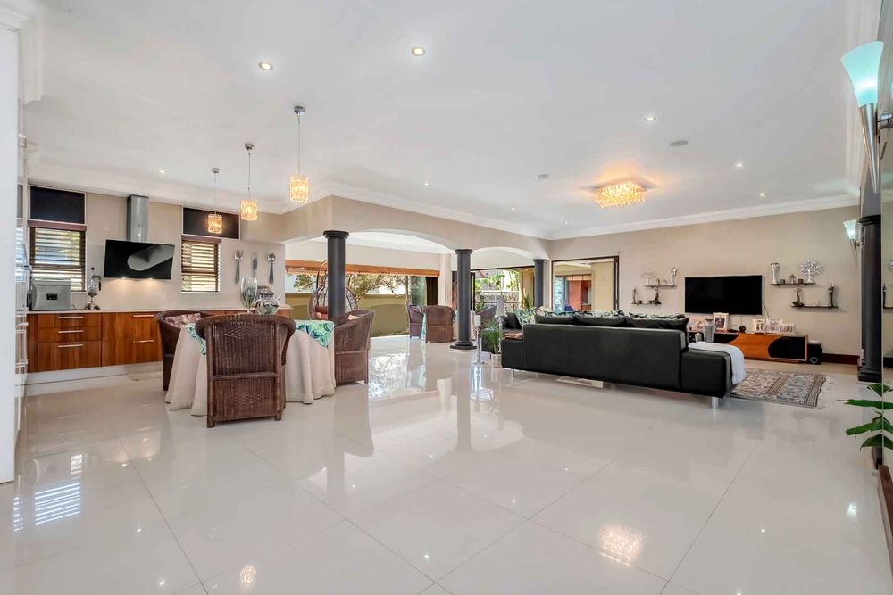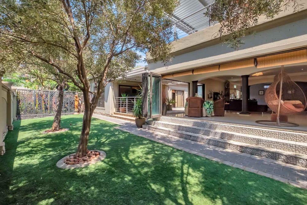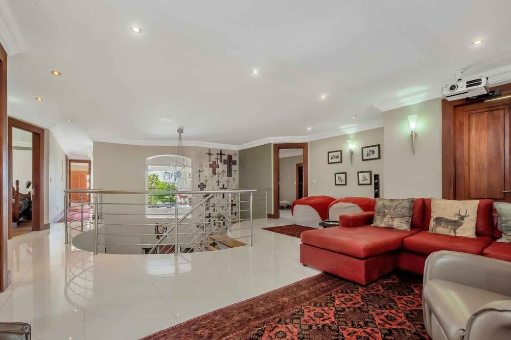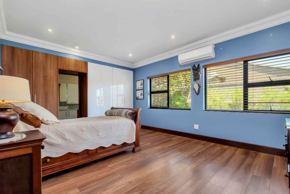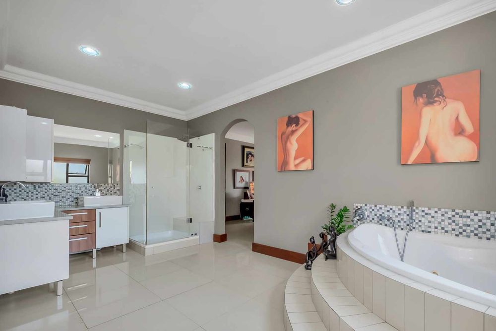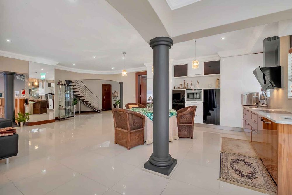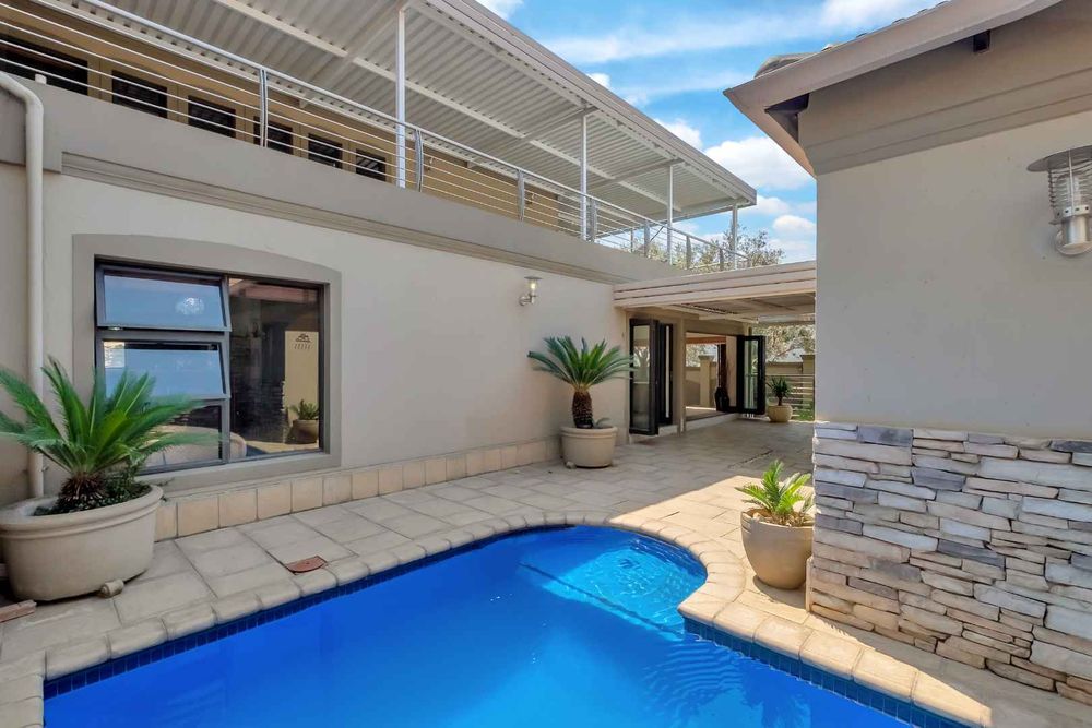 A home that has everything! Fully solar, borehole and the best in entertaining! This beautiful home has superb finishes throughout and, so many extra features designed to make your living experience so much better! A classy entrance, with a huge double volume window, allowing natural light in. The lounge, dining room, and bar are all beautifully combined to accommodate a large group of friends and family. This stunning indoor/outdoor lifestyle is what most families desire. There are two kitchens! One is for when you have a large party and the second one is for the family to gather around the eat in table and enjoy time together. There is a gas Siemens hob and deep fryer, eyelevel oven and so many cupboards. There is an integrated fridge/freezer. The laundry is completely separate and is really large. The laundry shute pops out in the laundry. Piped sound is very soothing for the entertainer mood.