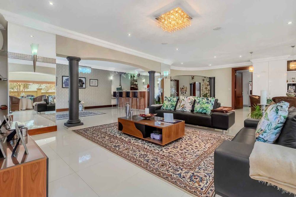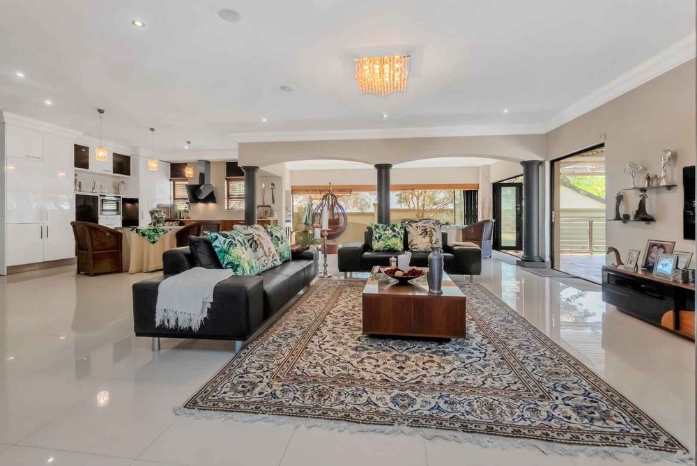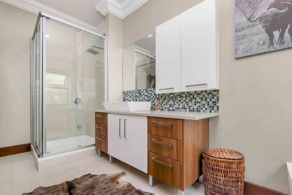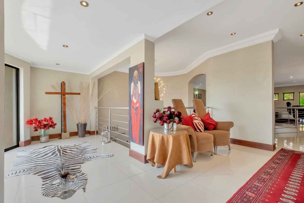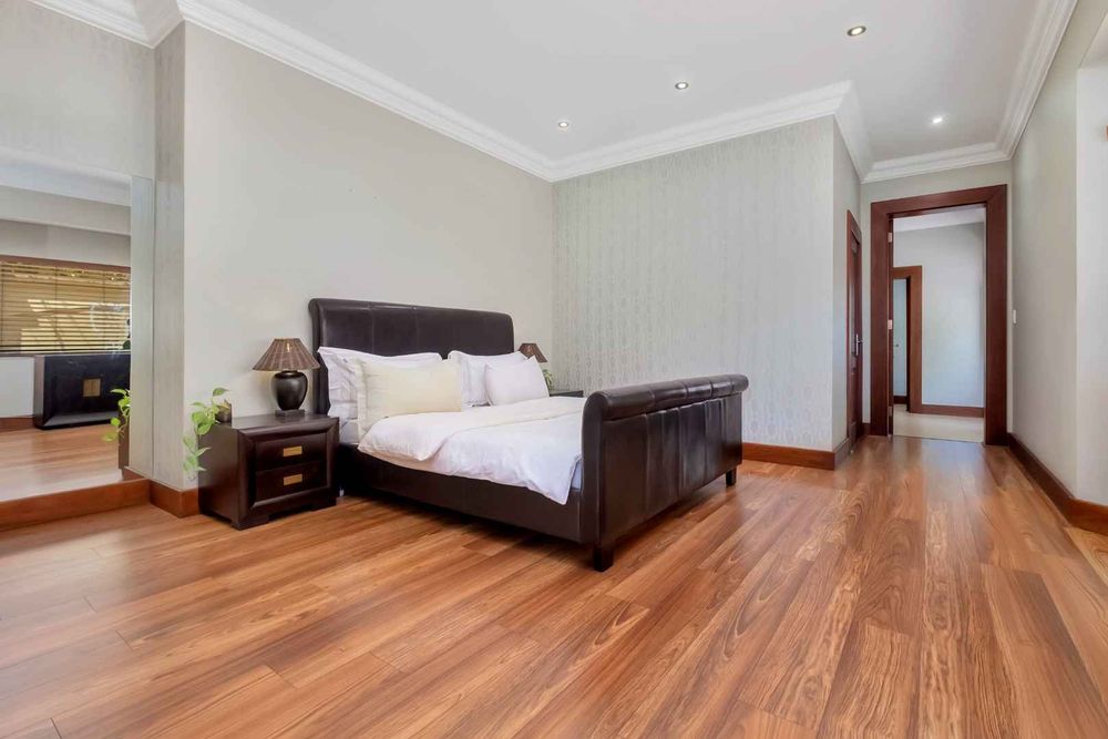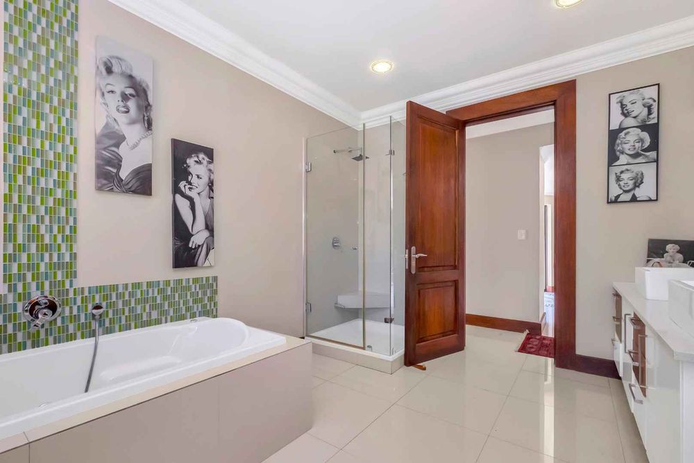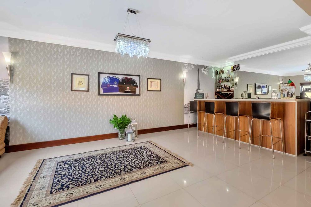 A home that has everything! Fully solar, borehole and the best in entertaining! This beautiful home has superb finishes throughout and, so many extra features designed to make your living experience so much better! A classy entrance, with a huge double volume window, allowing natural light in. The lounge, dining room, and bar are all beautifully combined to accommodate a large group of friends and family. This stunning indoor/outdoor lifestyle is what most families desire. There are two kitchens! One is for when you have a large party and the second one is for the family to gather around the eat in table and enjoy time together. There is a gas Siemens hob and deep fryer, eyelevel oven and so many cupboards. There is an integrated fridge/freezer. The laundry is completely separate and is really large. The laundry shute pops out in the laundry. Piped sound is very soothing for the entertainer mood.