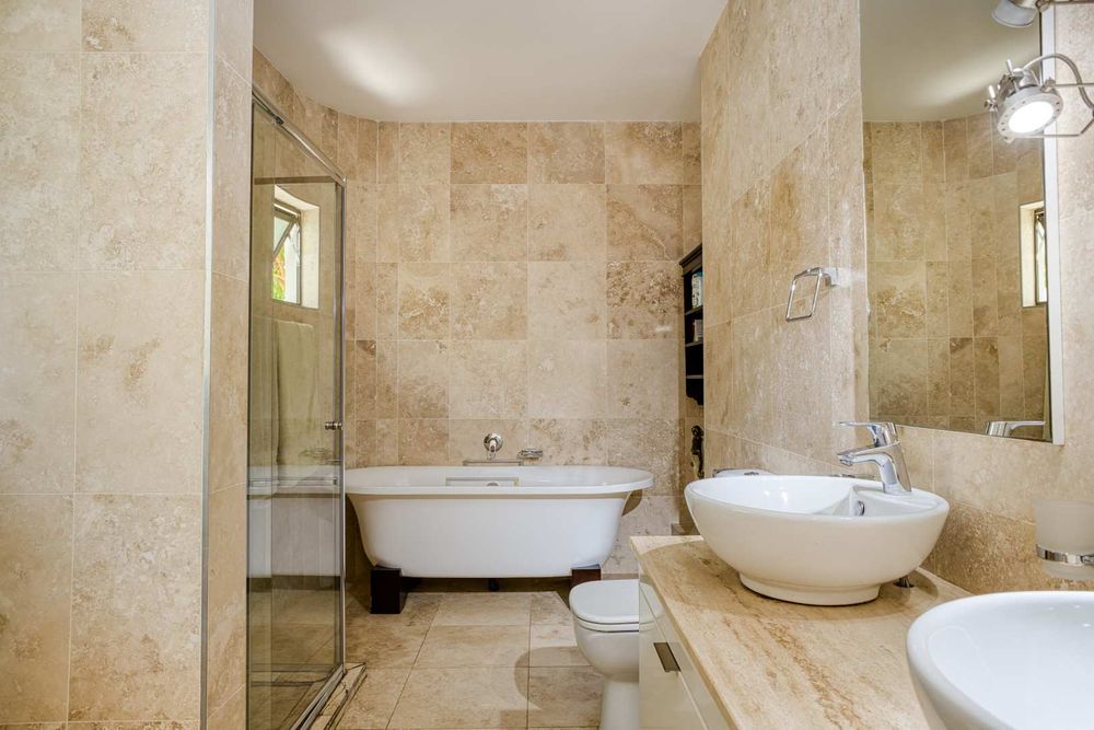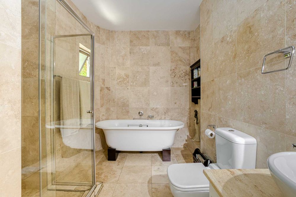 Enjoy the welcoming entrance with a huge living room or, ideal office on the left as you come in. There are two lovely en-suite bedrooms on this wing. The guest cloakroom is close by. The main lounge is very modern and there is a huge study or, additional living room. The dining room is open plan to the kitchen and has a door opening onto the covered patio and pool area. There are two more large en-suite bedrooms and the master has a separate sewing room or extra dressing room area. These two bedrooms have pool views with sliding doors. All the bathrooms are modern classic with travertine tiles.