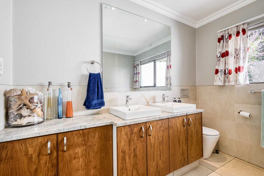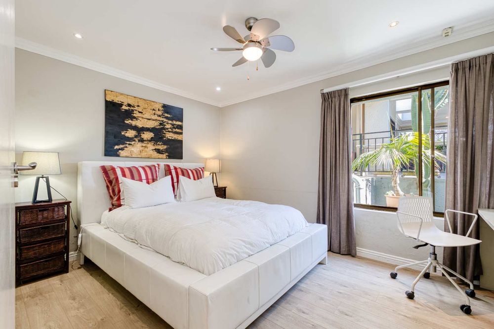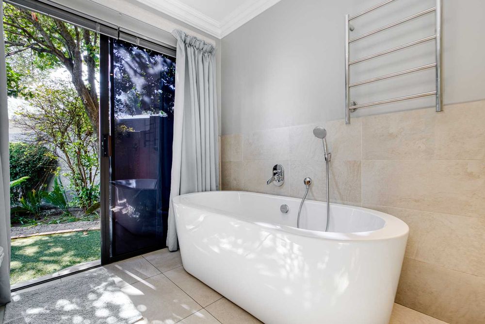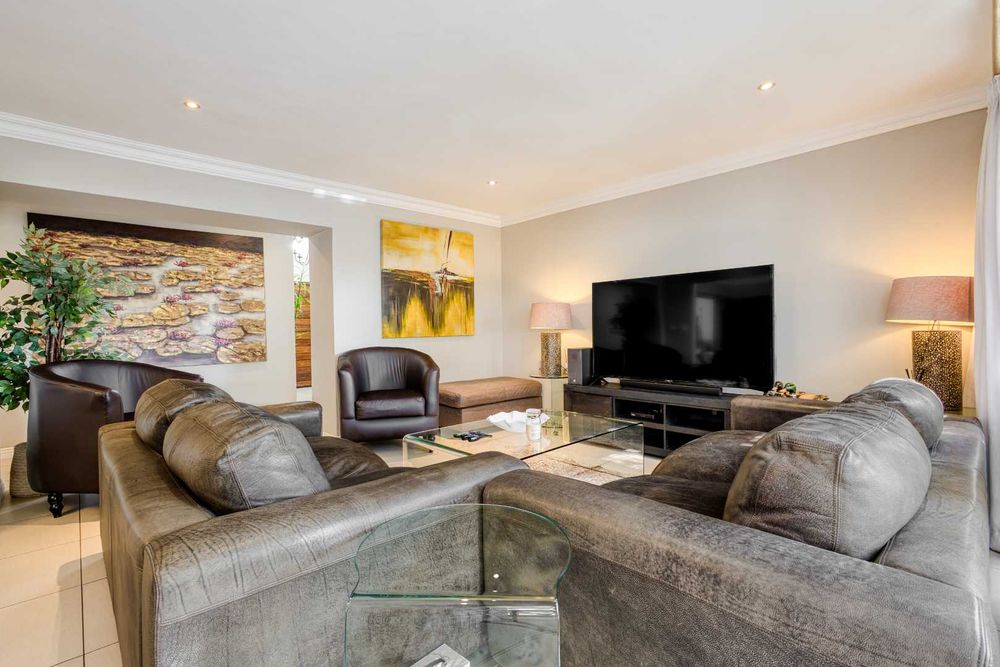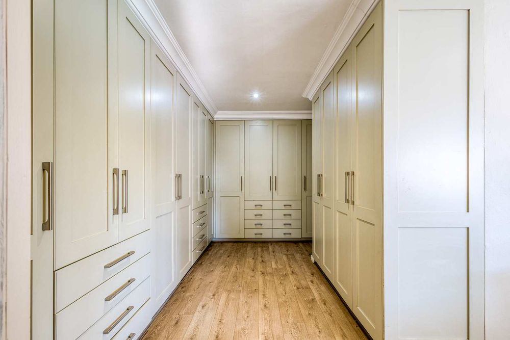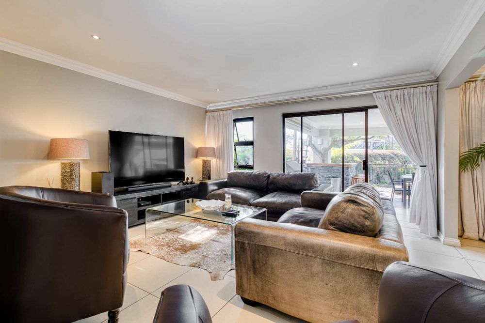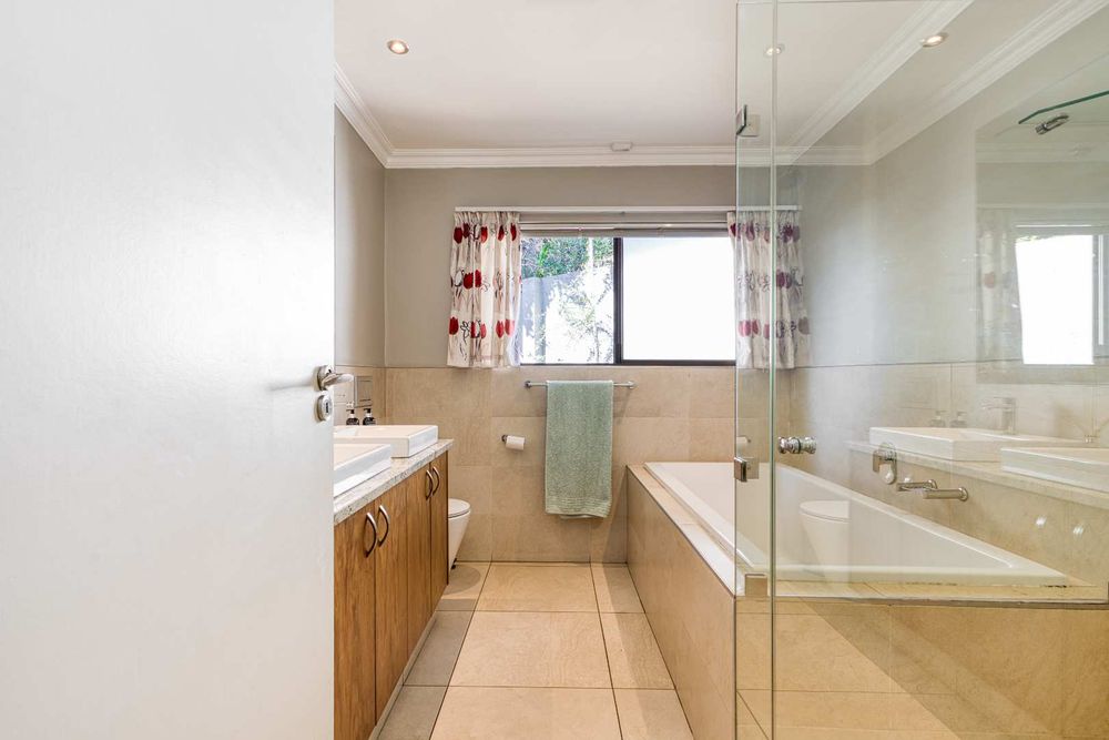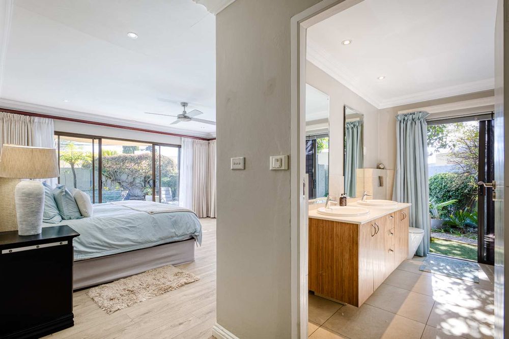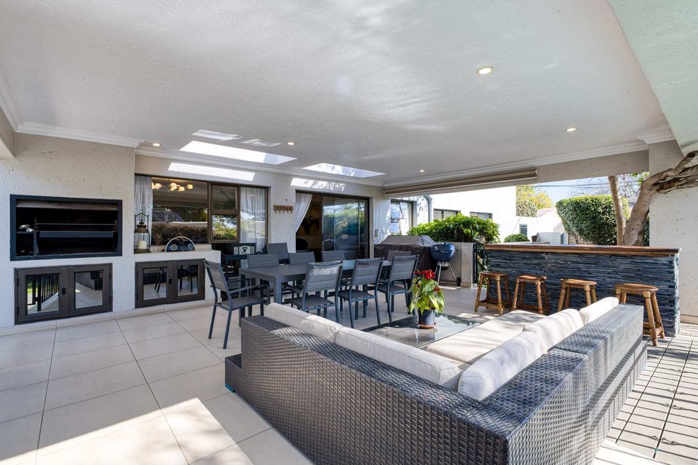 One of Fourways Gardens finer homes is now available for a new family! This stunning four bedroom home is the ultimate entertainer’s delight, offering seamless indoor-outdoor living and a host of luxurious features designed for hosting and relaxation. The home is absolutely gorgeous with spacious rooms throughout. Upon entry you are greeted by a lovely sun-filled double volume entrance with a private guest cloakroom. The lounge and dining room are open-plan to the lovely contemporary kitchen and they open onto the huge covered patio. Afternoon sun spills into the kitchen. The kitchen has black granite countertops, a breakfast bar, ample cupboard space, a gas Bosch hob, an eye-level oven and spacious walk-in pantry with a separate scullery. The patio is star of the show! Your own private oasis. The generously sized covered patio is the ideal setting for year-round entertaining, with a built-in bar and a feature tree that overlook the newly resurfaced sparkling swimming pool framed by the beautifully landscaped garden. There is ample space for a dining suite and a lounge suite on the patio as well. The built-in charcoal/wood braai is fully covered.