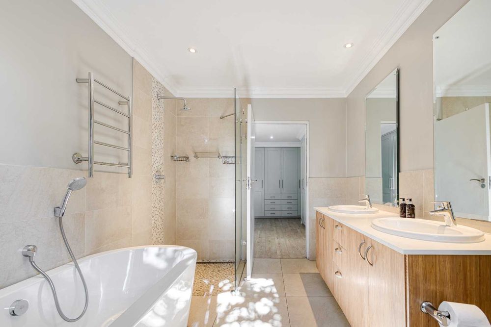The layout of this single storey home is practical and family-friendly. The family room has a Bosca closed combustion wood burning fireplace that radiates heat to warm up all the living areas. There is a fitted study with built-in wood cupboards that have a painted finish, giving this area a modern timeless touch. There are 4 bedrooms with 3 bathrooms with all modern finishes in the bathrooms. Three bedrooms are on one wing and the 4th bedroom is on the other side of the house. Two bedrooms are en-suite. The sizeable main bedroom has a private dressing room and has air conditioning, the main en-suite bathroom has its own view over a private section of the garden and an outdoor shower for summer use. The 4th guest bedroom leads out onto a small garden so, it is also ideal for grandparents to live with you.