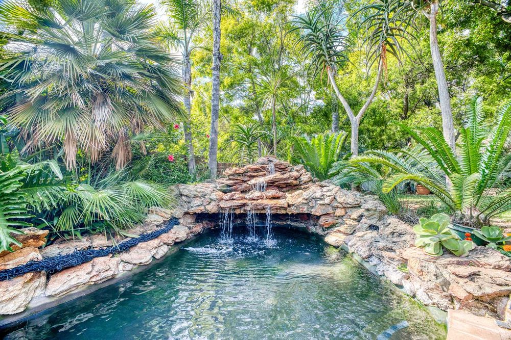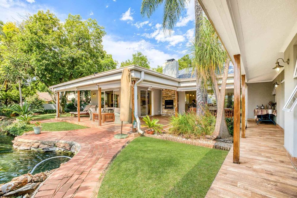 A pretty entrance opens onto a lovely open plan dining room and kitchen, flowing onto the large covered patio, with a built-in braai. Sunsets are a daily treat in this house! The formal lounge has access to the patio and garden and a wood fireplace. The garden is well established with a feature pool.