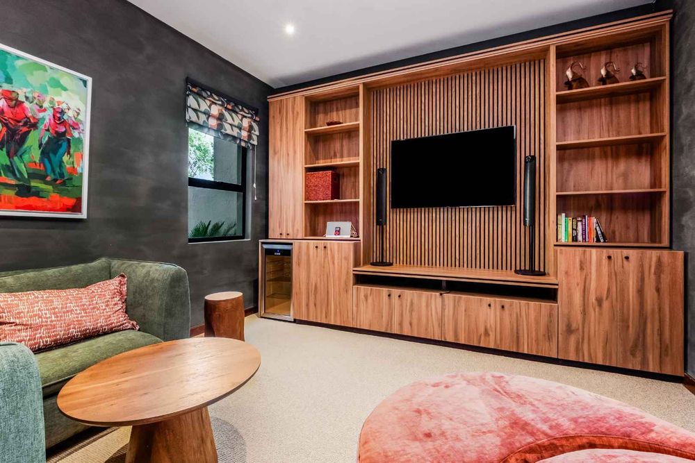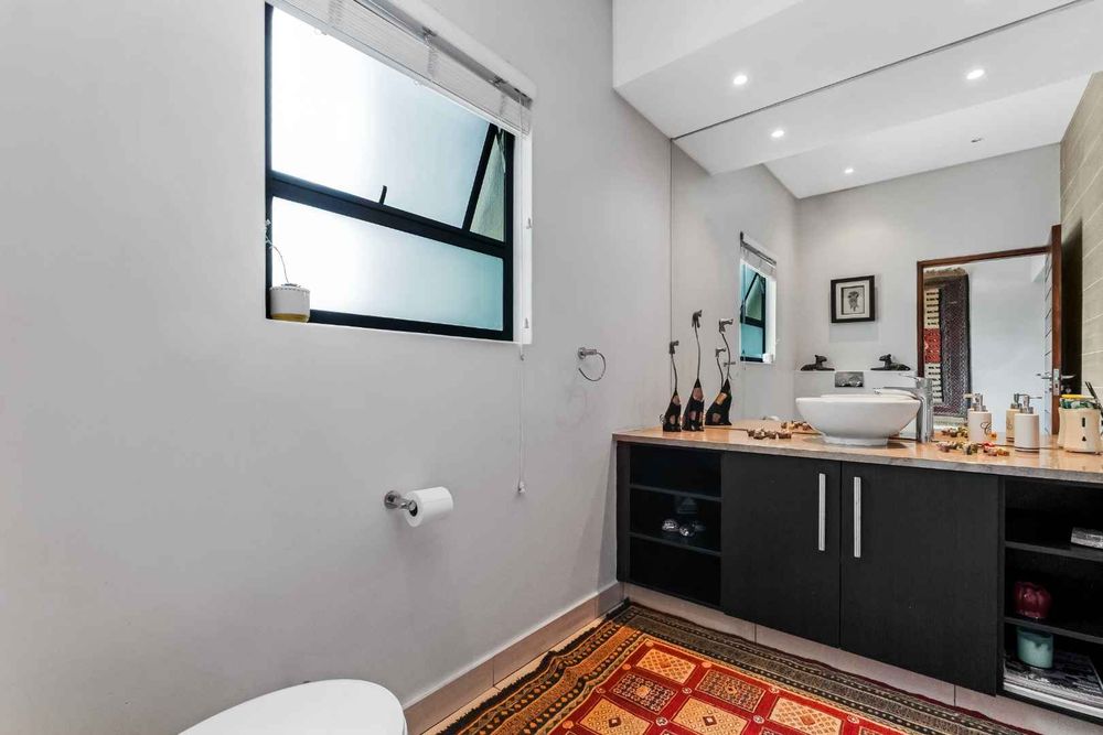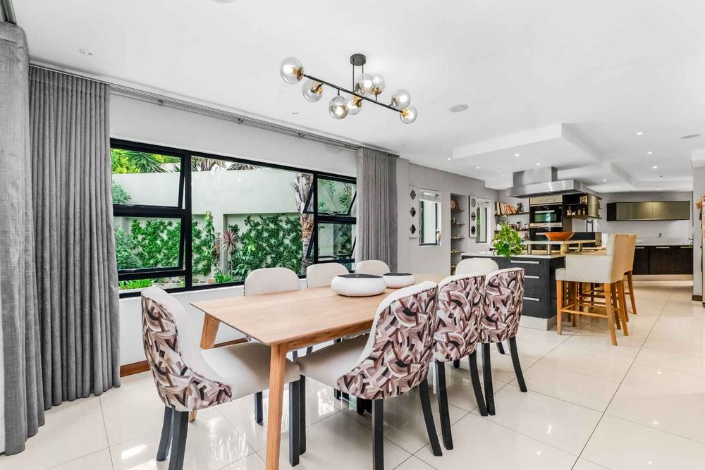 The ultra-modern kitchen is a Chef’s delight, having Caesar stone tops, high gloss cupboards, centre island, combination of gas & electric hob, Miele double oven & microwave. Walk-in pantry cupboard and separate scullery / laundry area. The kitchen is open and flows into the dining room. The downstairs floor plan also includes a fitted study, spacious guest bedroom en-suite with lounge area which opens out into the garden plus a guest toilet.