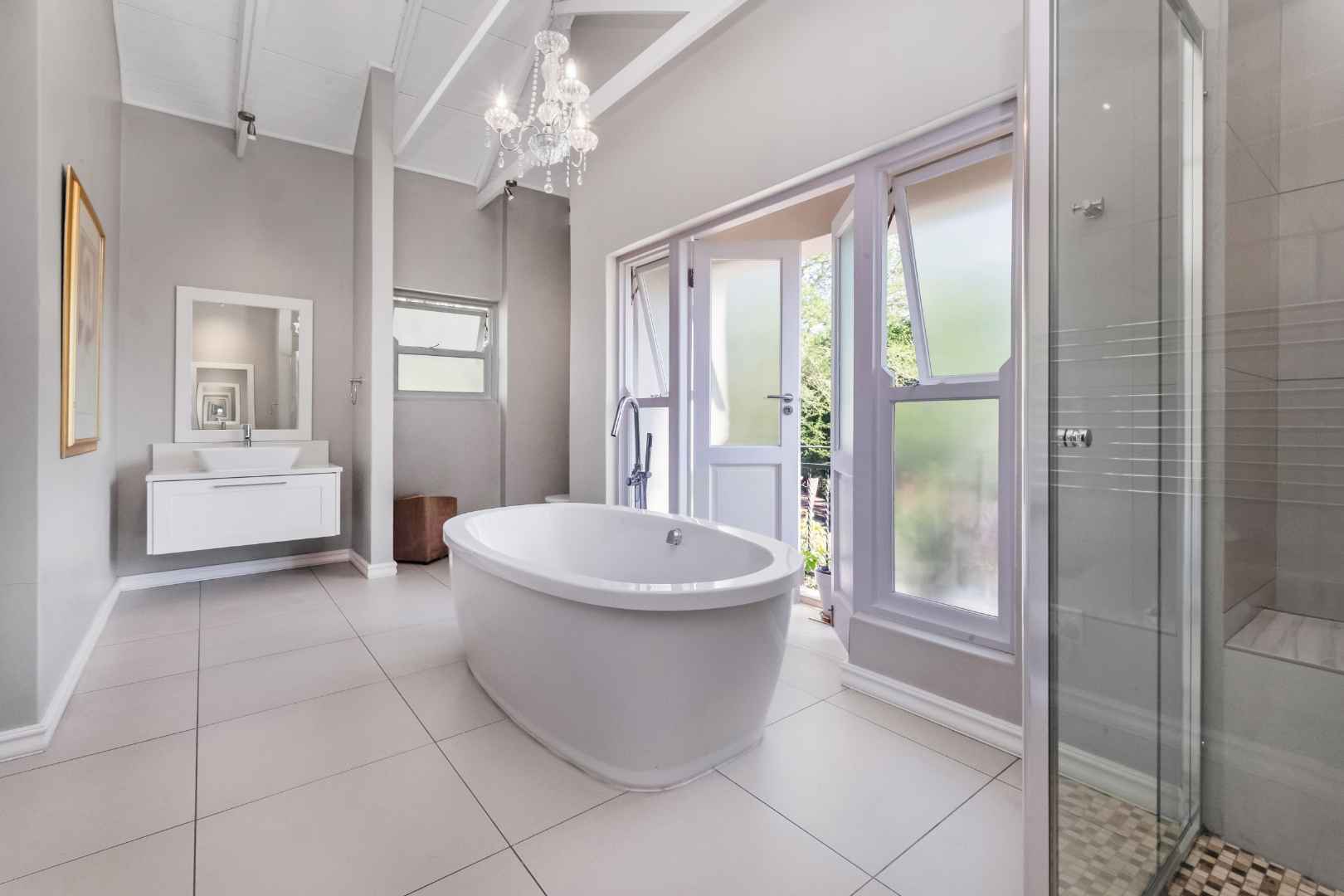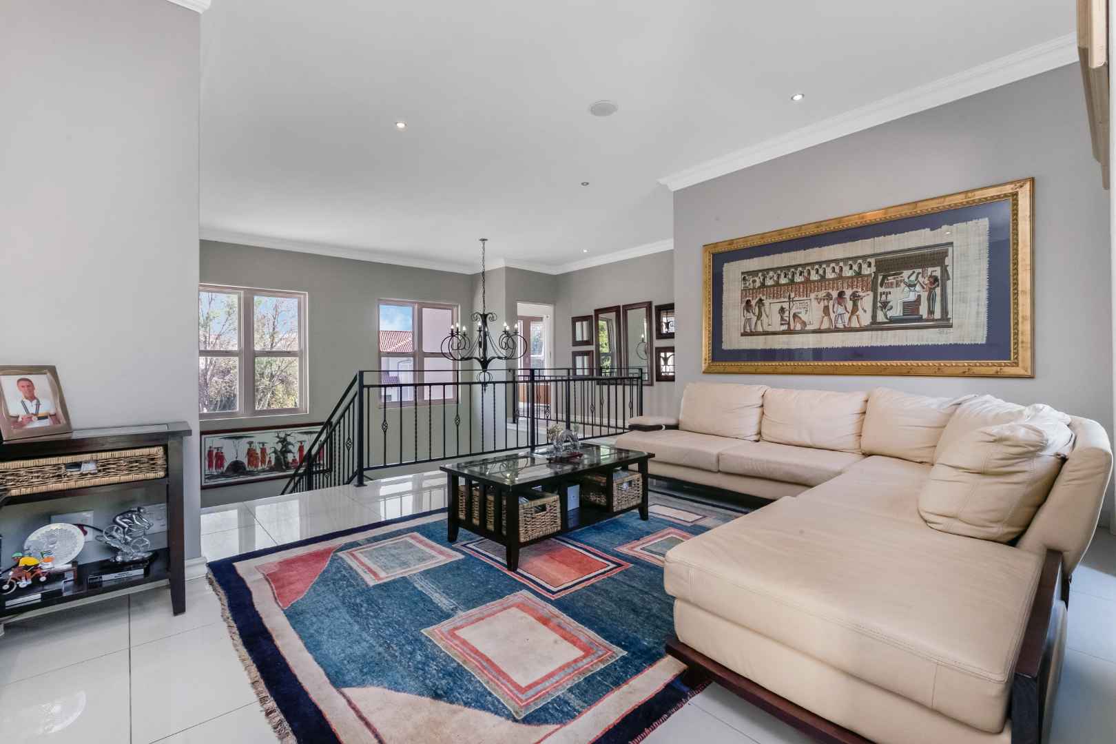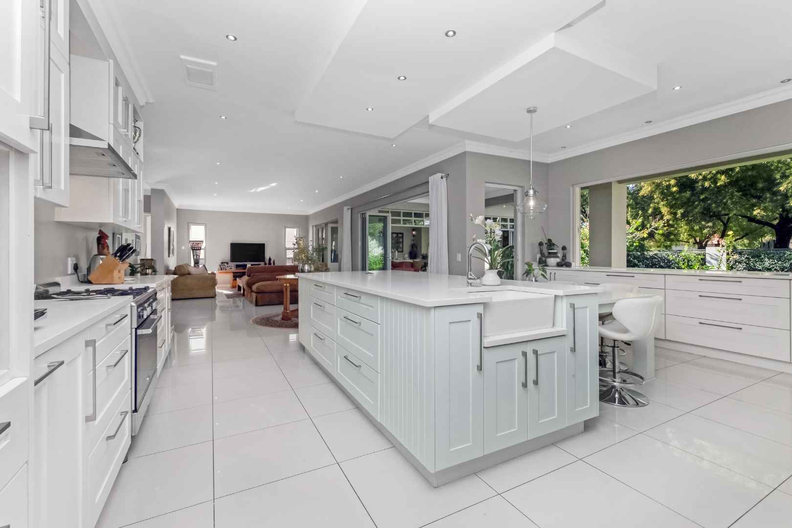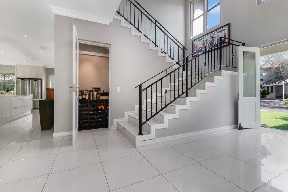 Inviting double volume entrance hall will set the tone of what’s ahead, it spills onto the open plan formal/family lounge and dining area all boasting surround sound - these reception areas together with the enclosed patio are designed for entertaining, hosting those parties and get togethers, opens onto a covered patio with gas braai, overlooking the manicured private garden. The upgraded modern kitchen is designed for convenience and has Caesarstone countertops, a massive breakfast bar / middle-island with a, gas hob, an electric oven and extractor fan, filter tap prep bowl, double door fridge space, separate scullery area which can accommodate all your under counter appliances, plus ample built in cupboard space. The kitchen scullery opens onto a backyard with JOJO water tanks that boost into the home with a pump. The downstairs floor plan also consists of a classy air-conditioned wine cellar, plus a guest suite which enjoys its own private garden and en-suite bathroom.