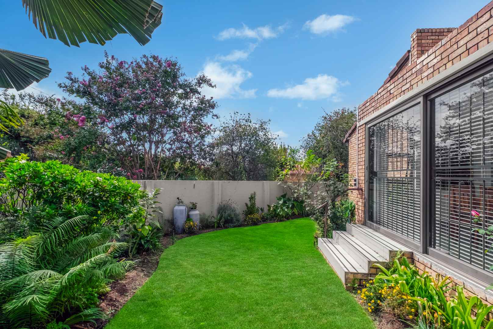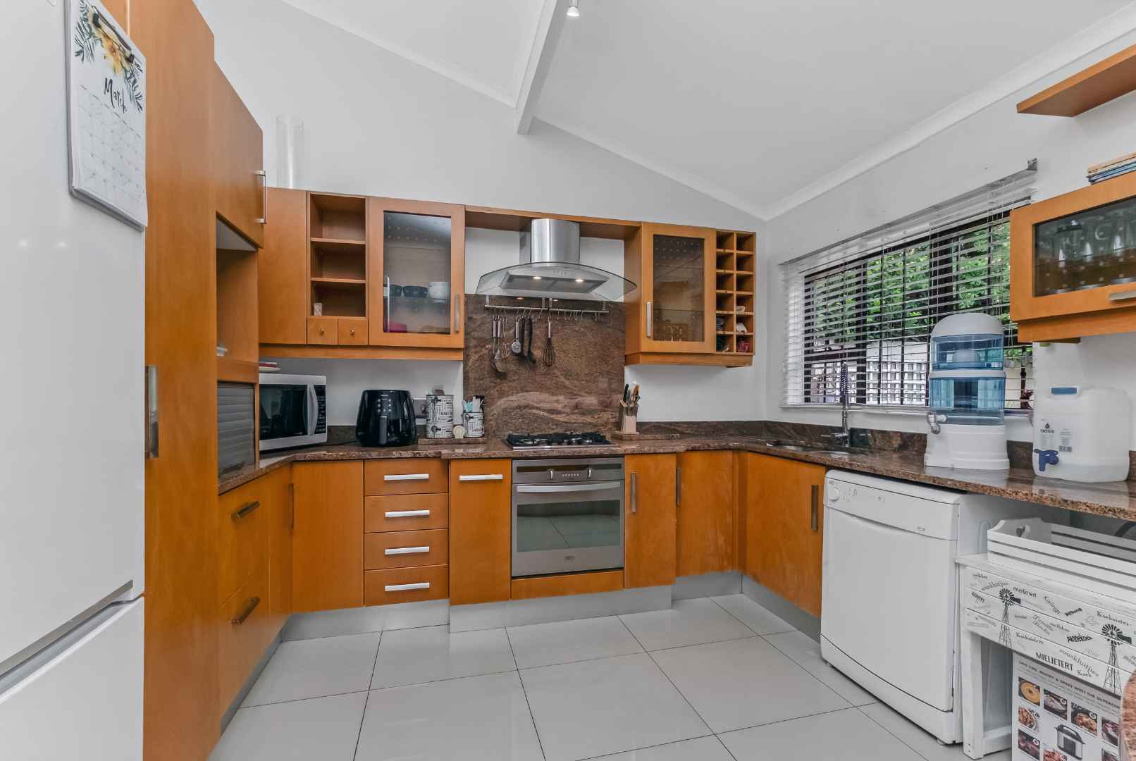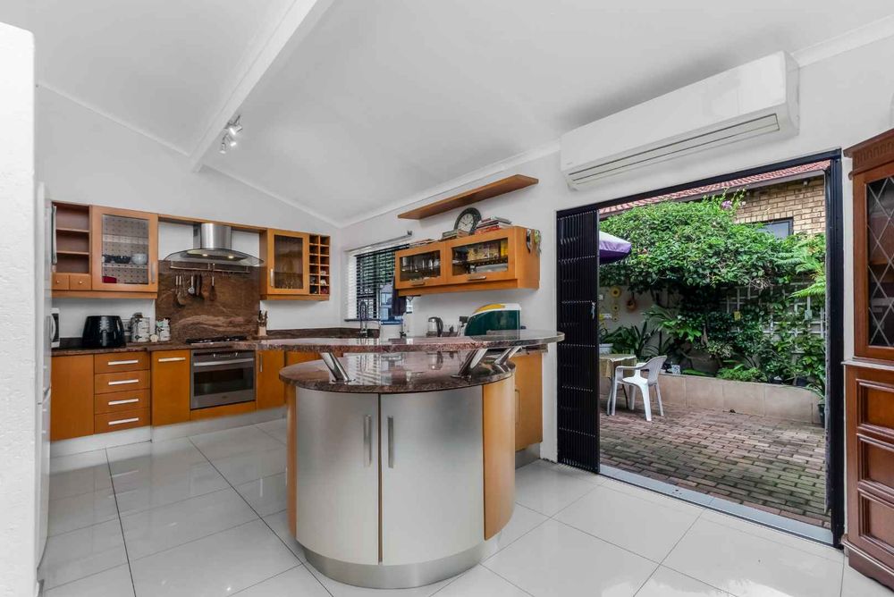 The welcoming entrance flows onto an open plan family lounge and dining area, spilling out onto the manicured tree-lined garden. The dining area is adjacent to the kitchen with granite countertops, gas hob with electric oven plus extractor fan, double door fridge space, breakfast bar, under counter space to accommodate 2 wet appliances, plus ample built-in cupboards. The kitchen opens onto a lovely private courtyard and ideal space for a herb garden and spot to sit and enjoy your coffee in the mornings.