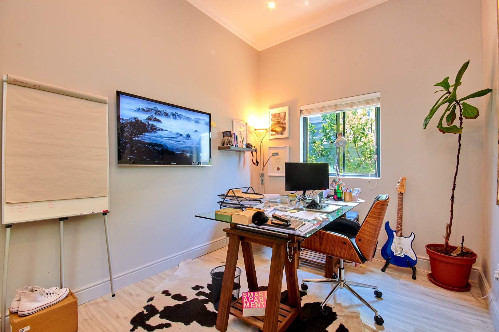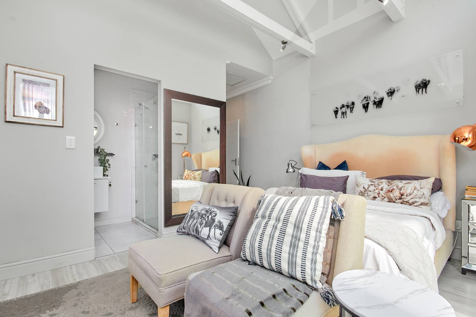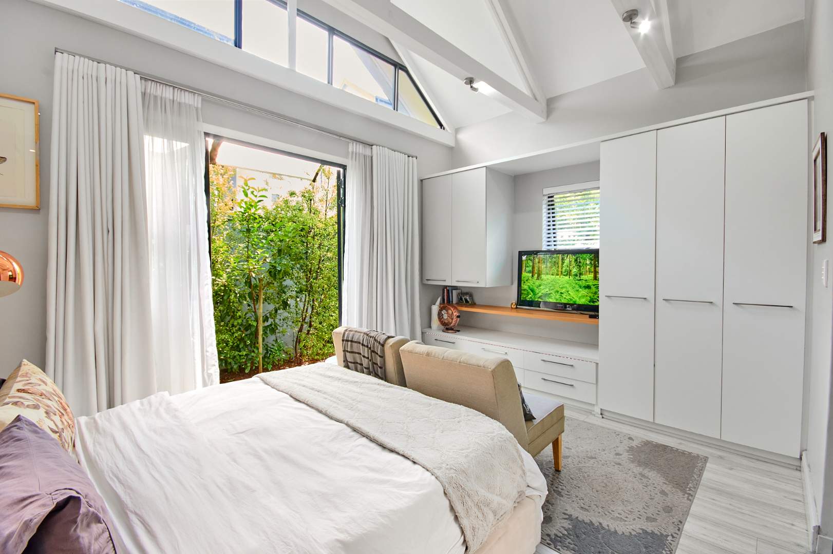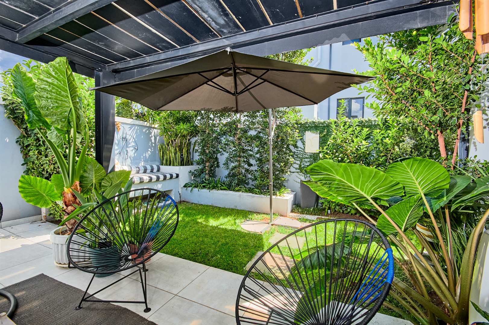 The 2 generous size bright and airy bedrooms all have built in cupboards are tiled and 2 bathrooms. The master bedroom boasts exposed trusses, opens to the garden giving it a nice breeze when one is relaxing in bed and has a main en-suite.