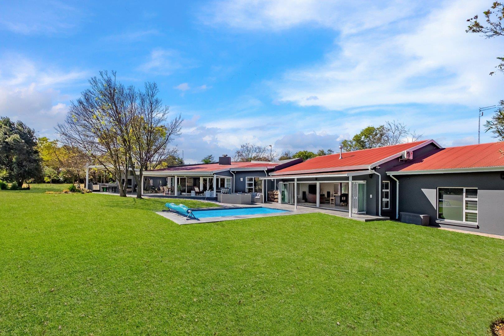 This enviable country retreat will excite and inspire you, boasts a bold and inviting reception hall flowing onto an open plan formal lounge with a feature wood-burning fireplace and built-in bar. Divine dining space is adjacent to the formal lounge and opens with sliding doors onto a covered patio with motorized screens, enabling this area to fully enclose. Living areas have integrated Musical music system. A fire-pit seating area and full outdoor kitchen braai area is breezy, brand new, and beautiful. Such a peaceful and tranquil setting, picture-perfect every day. A large entertainment room with a grand slam winner bar opens with folding stacking double glazed doors onto the sparkling swimming pool. This ideal space for outdoor/indoor entertaining is air-conditioned and has a wood-burning fireplace and guest loo. Gorgeous country style open plan kitchen with Caesarstone countertops, SMEG 5 plate gas hob and extractor fan, 2 ovens and a warmer with a butler prep basin and walk-in pantry, breakfast nook, separate scullery with storage and dishwasher space, double door fridge space, laundry area that can accommodate 3 appliances, and an ironing section. The guest's cloakroom is neatly tucked away.