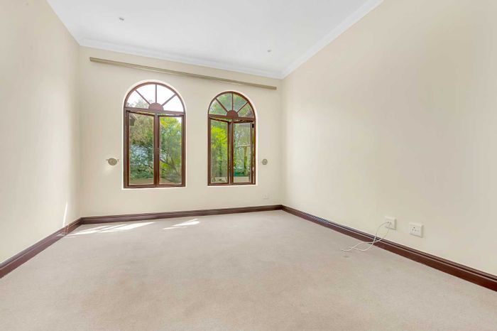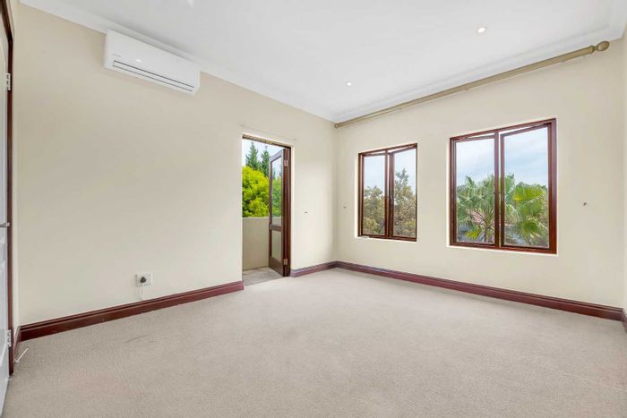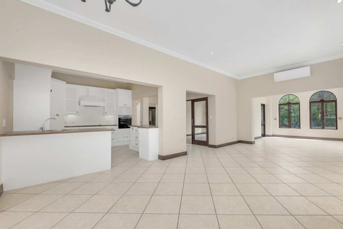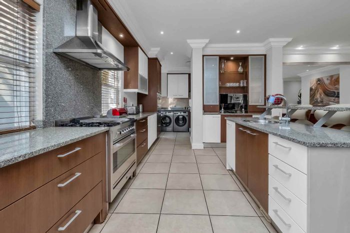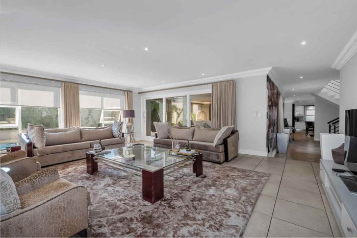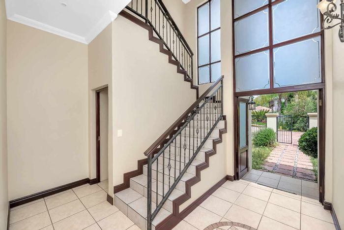 Entertainer's family retreat in Dainfern Valley cul-de-sac, renovated with sunlit living areas and separate guest wing. Covered patio with built-in braai overlooks pool; five bedrooms, 4.5 bathrooms, three garages.
