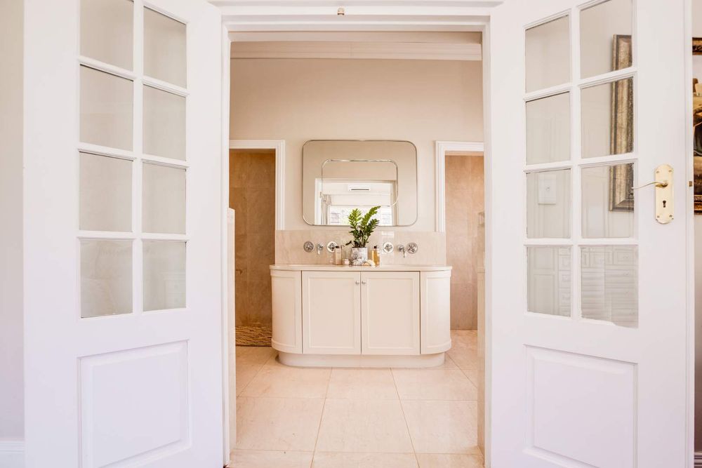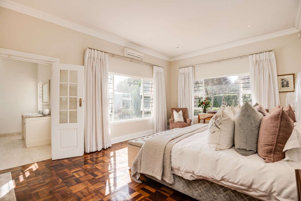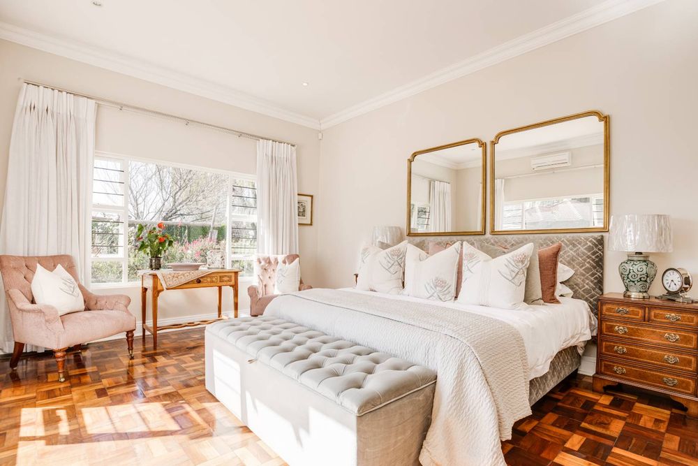 The spacious hallway with refurbished parkay flooring lures one to the 3 light, bright and generous sized bedrooms all boasting ample built-in cupboards, and with each bedroom enjoying views onto sections of the manicured garden, plus 3 bathrooms (MES).