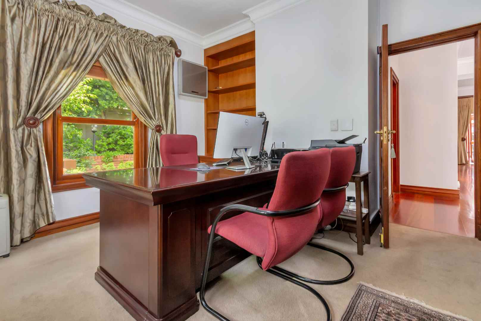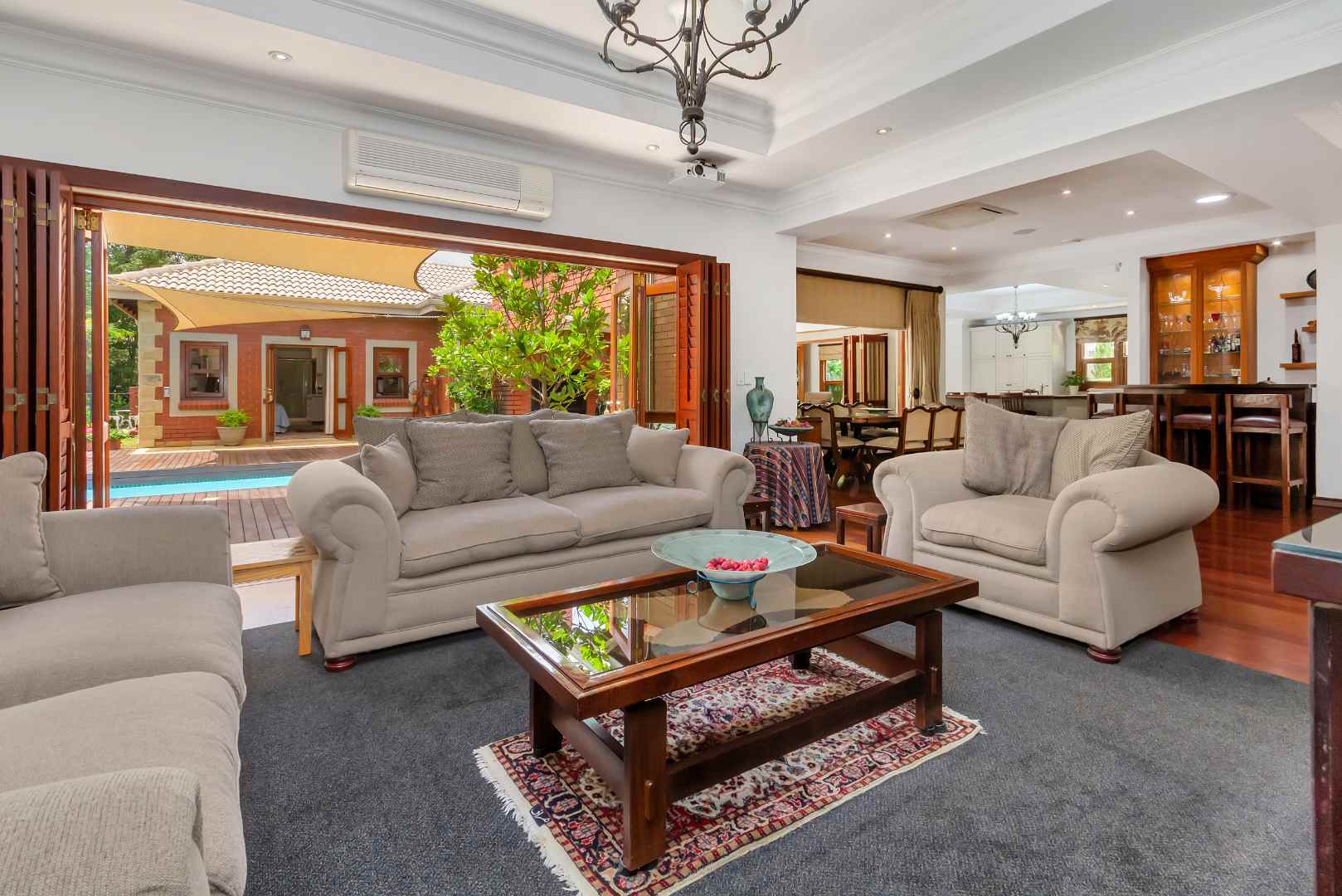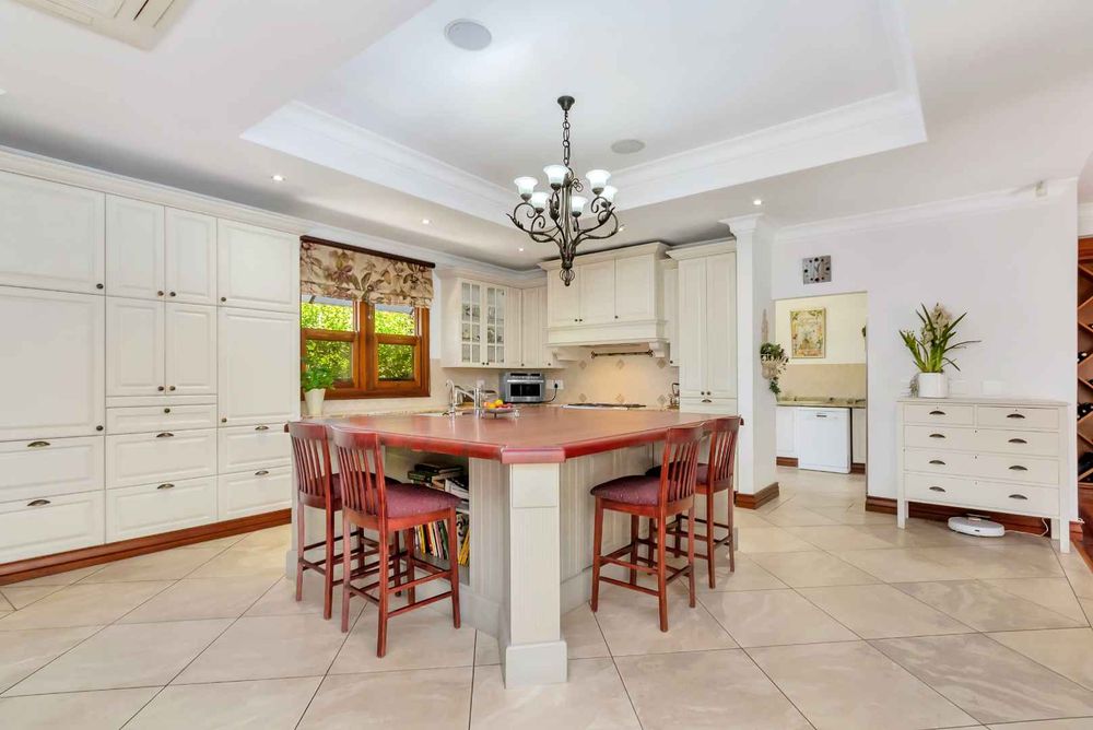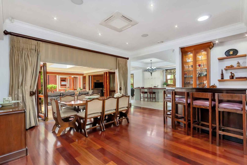 Elegant well designed single storey family home oozes with exceptional spaces, plenty natural light, boasts privacy plus functionality - all of these attributes are everything a family is looking for. Alluring entrance hall which leads you to the formal lounge enjoys the picture perfect glance of the stunning garden through the wooden framed windows. The open plan dining area and fitted bar is situated adjacent to the awe-inspiring kitchen - making entertaining an absolute dream. The country style kitchen offers a balance of traditional aesthetics and practical features, making it the heart of this home - it boasts granite countertops, a SMEG 5 plate gas hob, electric oven plus extractor fan, expansive breakfast bar/centre-island, fully integrated under counter fridge and water purifier, separate scullery/laundry area to accommodate all your appliances, plumbed double door fridge space, plus ample built-in cupboards. The family lounge is an awesome open and airy space with a feature built-in log burner and houses the integrated home entertainment systems. Both lounges spill out onto an entertainers patio with a misting cooling feature and fitted gas braai, overlooking the sparkling swimming pool and manicured wrap-around garden. A private and spacious work from home office and guest bathroom are both neatly tucked away and complete the front section of the floor plan.