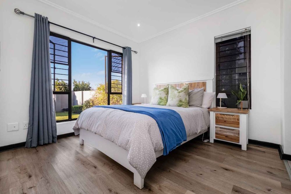 Delightful open plan lounge, spilling out onto a covered patio, overlooking a manicured garden. Spacious and modern eat-in kitchen with Caesarstone counter tops, centre-island / breakfast bar, floating shelves, under counter space for 2 appliances, single door fridge space plus ample built-in cupboards.