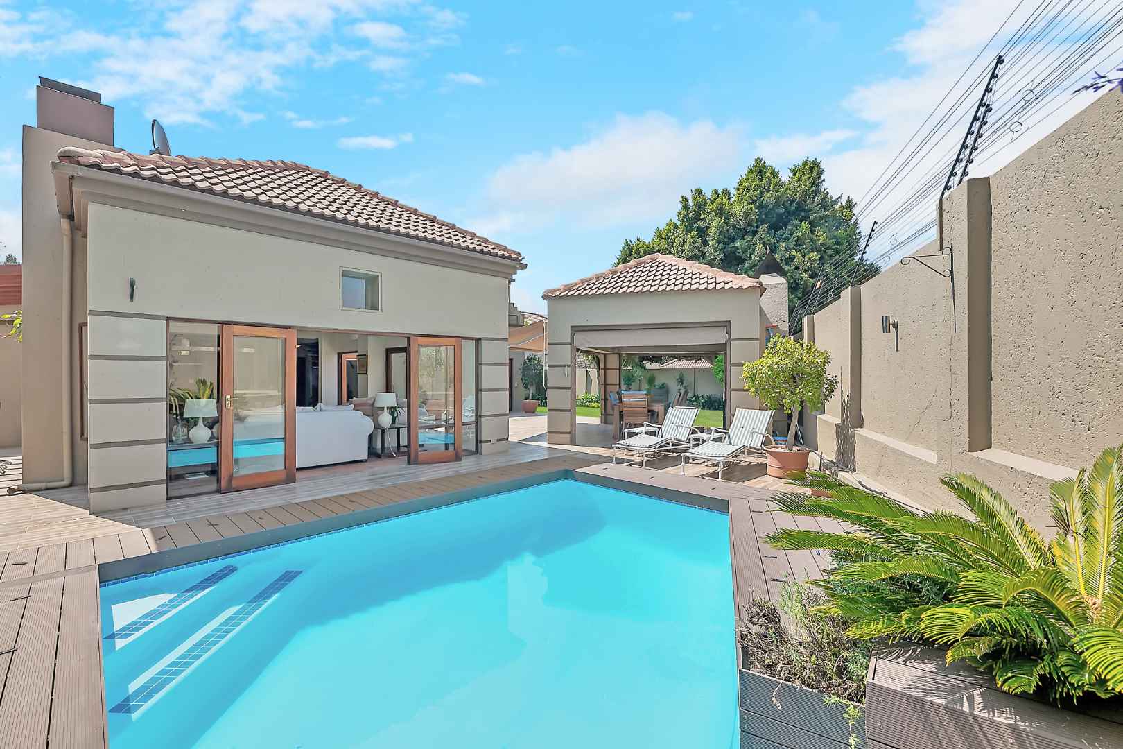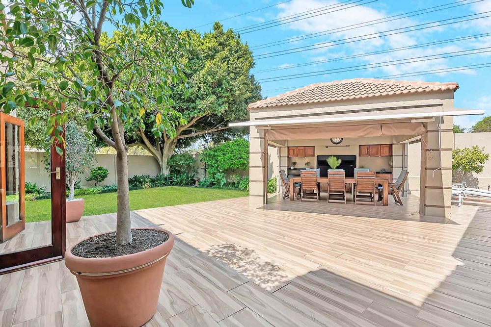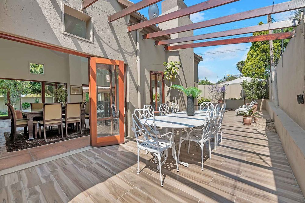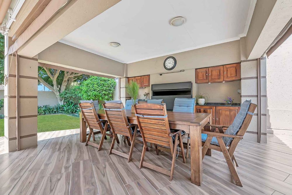 A welcoming entrance lures you onto a flexible entertainers dream layout. Open plan formal lounge and dining area with double volume ceilings and a wood burning feature fireplace, spills onto a entertainers patio, overlooking the manicured irrigated garden and sparkling solar heated decked swimming pool - offering the utmost privacy. A covered patio section with fitted rollable blinds and retractable awning is ideal to host family and friends all year round, plus it has a built in wood burning braai area. This home is fabulous as it leans towards indoor/outdoor living, something that we love doing. The open concept kitchen is ideal for entertaining and boasts granite countertops, a breakfast nook, water filtration system, gas hob with extractor fan and eye-level oven, double door fridge space, separate scullery with under counter space to accommodate your appliances, plus ample built-in cupboard space.