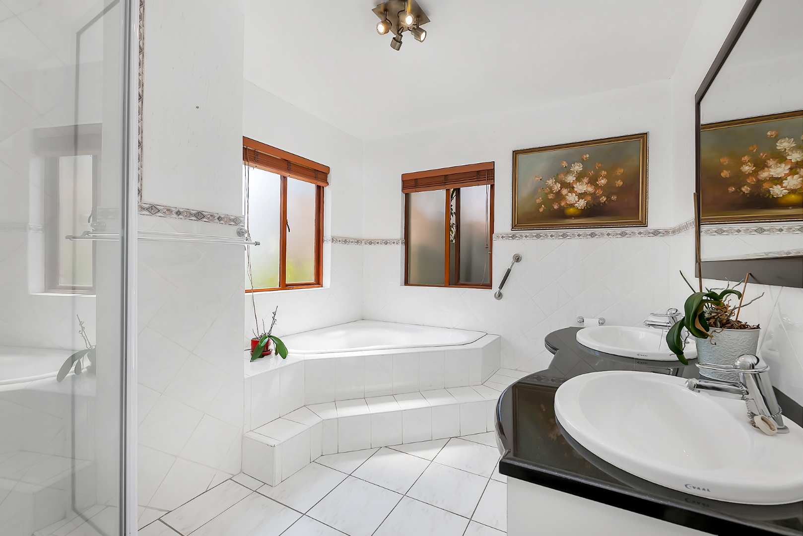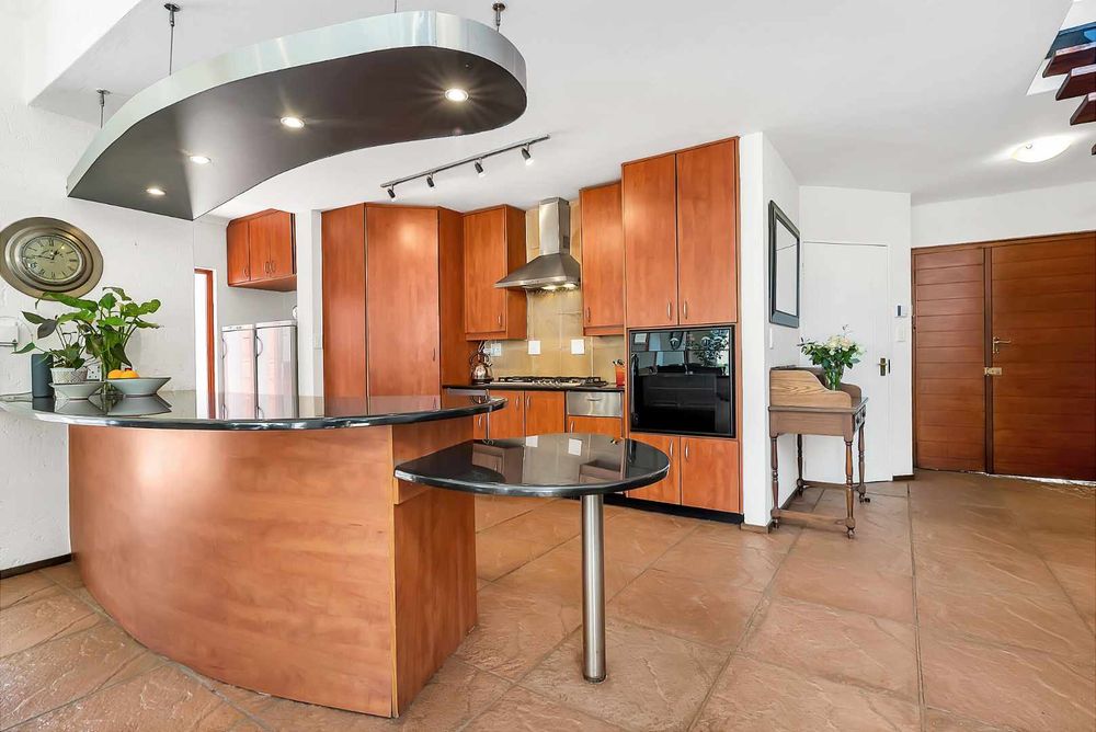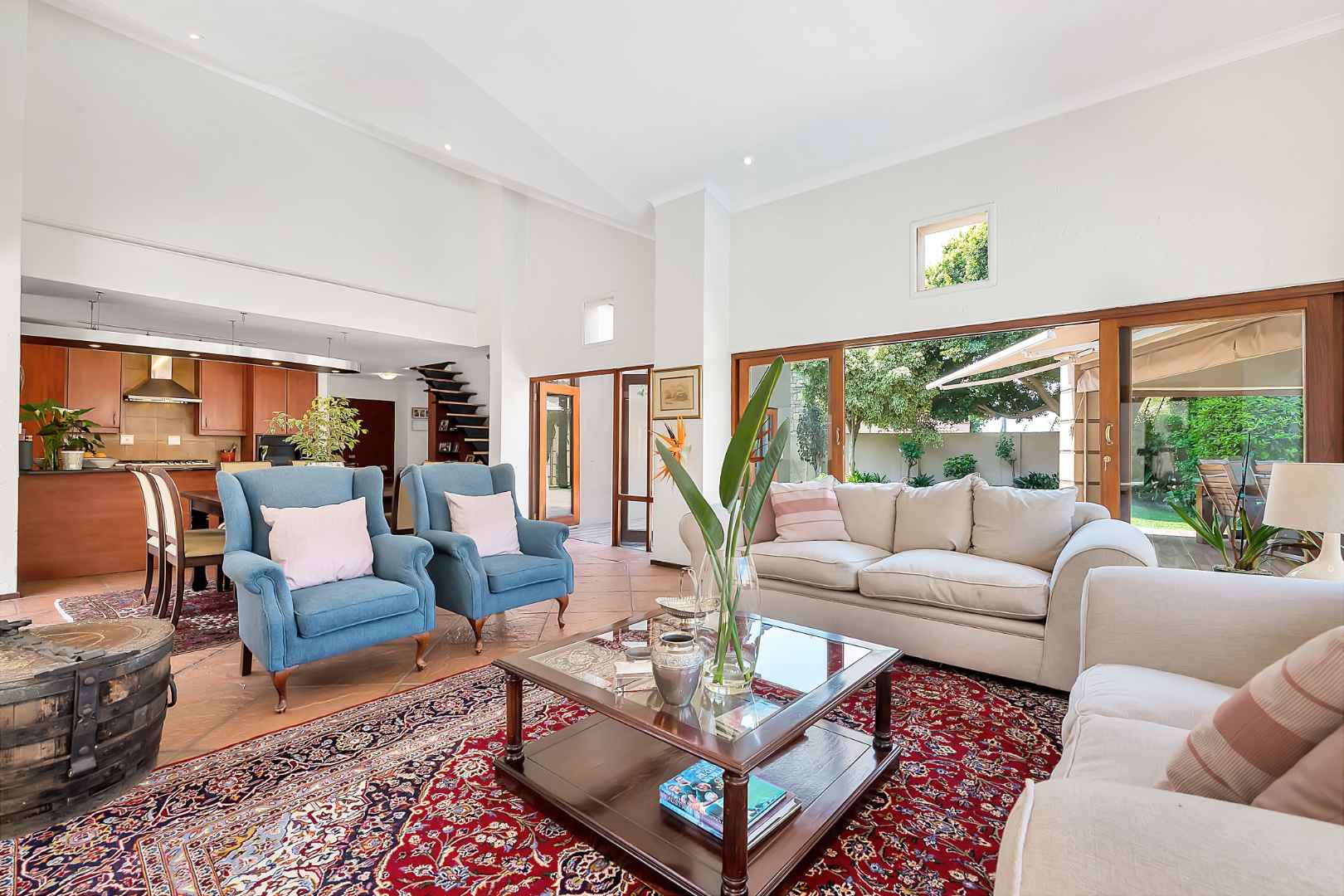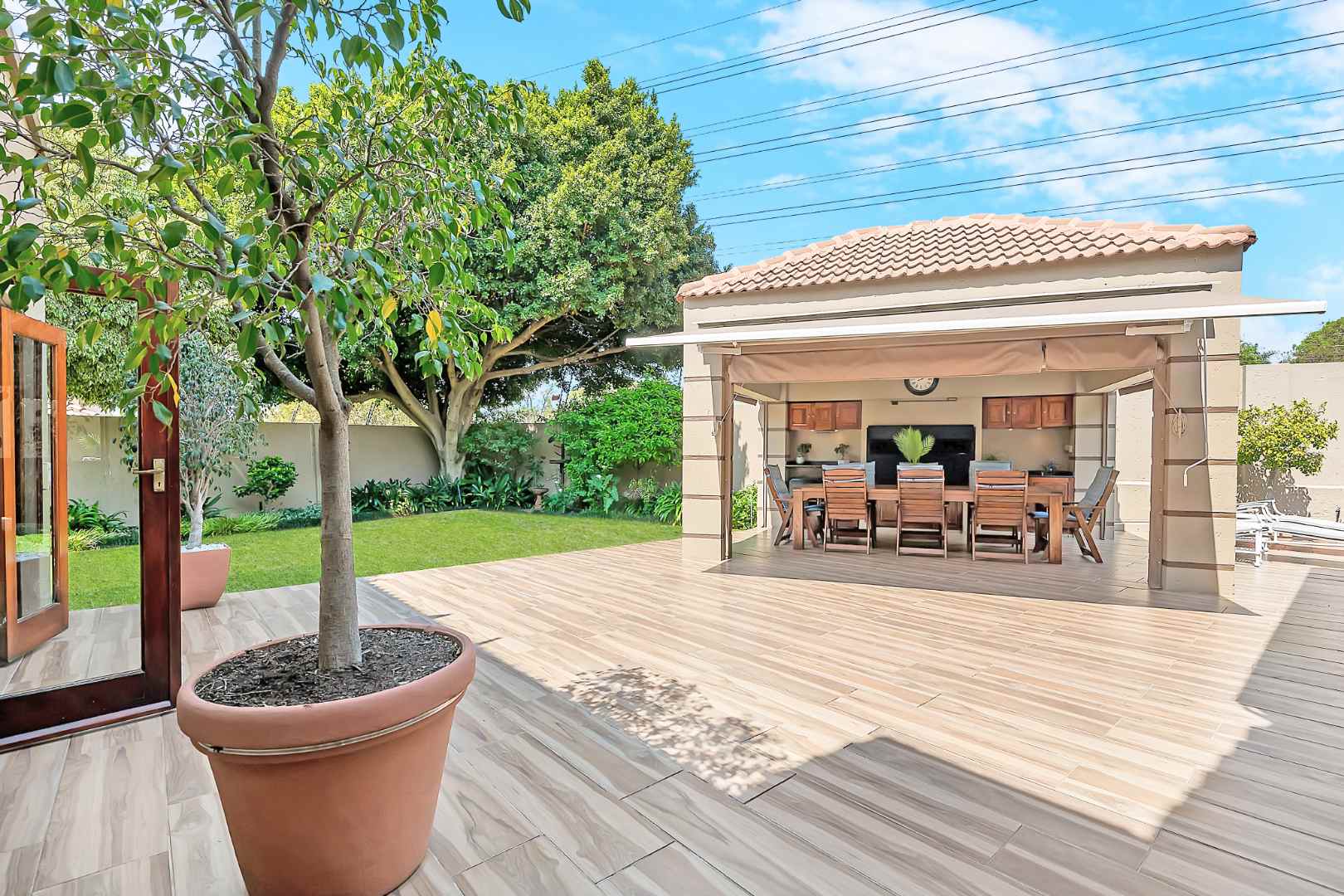 A welcoming entrance lures you onto a flexible entertainers dream layout. Open plan formal lounge and dining area with double volume ceilings and a wood burning feature fireplace, spills onto a entertainers patio, overlooking the manicured irrigated garden and sparkling solar heated decked swimming pool - offering the utmost privacy. A covered patio section with fitted rollable blinds and retractable awning is ideal to host family and friends all year round, plus it has a built in wood burning braai area. This home is fabulous as it leans towards indoor/outdoor living, something that we love doing. The open concept kitchen is ideal for entertaining and boasts granite countertops, a breakfast nook, water filtration system, gas hob with extractor fan and eye-level oven, double door fridge space, separate scullery with under counter space to accommodate your appliances, plus ample built-in cupboard space.