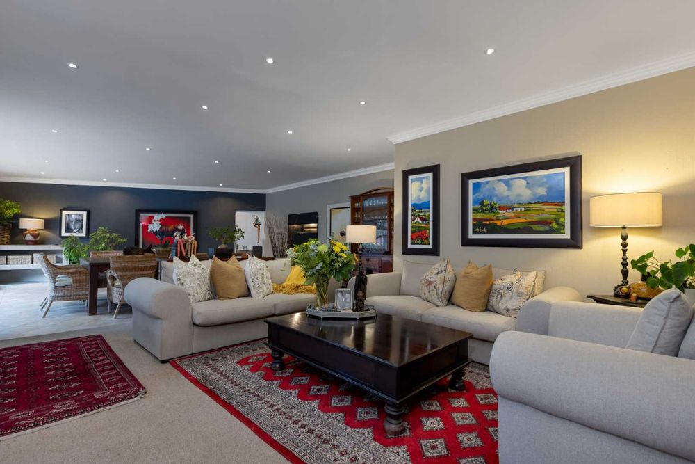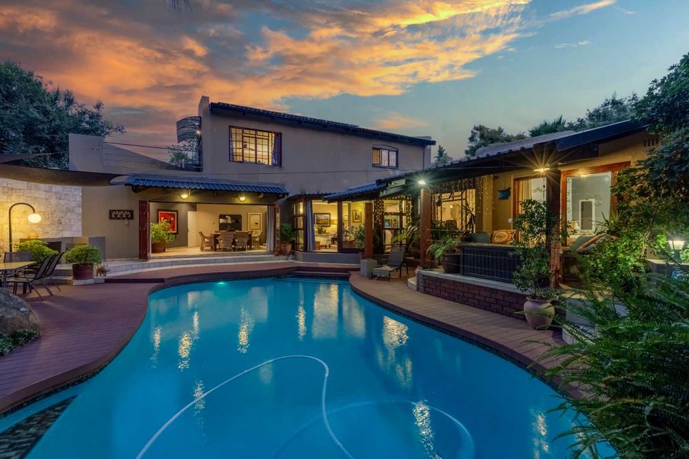 A welcoming entrance lures you onto a flexible layout that’s cozy and well-proportioned, boasting a great layout for relaxed living. Open plan formal lounge and dining area just spills out effortlessly onto the decked swimming pool, overlooking the private manicured lawns and established trees - offering the utmost privacy. The patio has a built-in wood burning braai and a fitted server. A sizeable family lounge is tucked away for the family to relax and unwind. The country style kitchen boasts granite countertops, a gas hob with eye-level ovens plus extractor fan, double door fridge space, separate scullery area with under counter space to accommodate your appliances, plus ample built-in cupboard space. His and hers study areas are ideal for a work from home space. A guest cloakroom and storeroom are neatly tucked away.