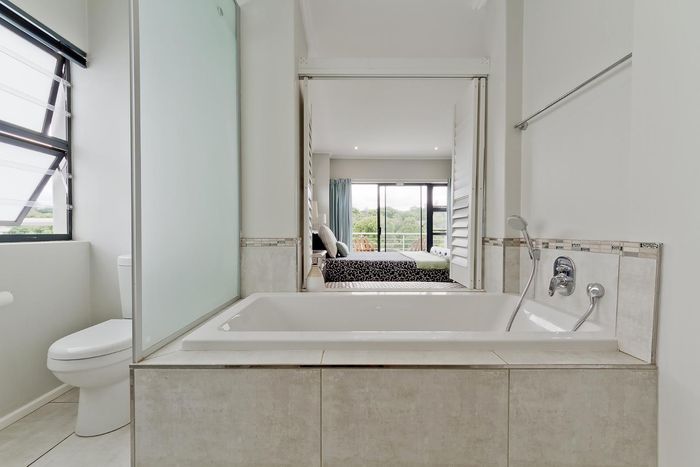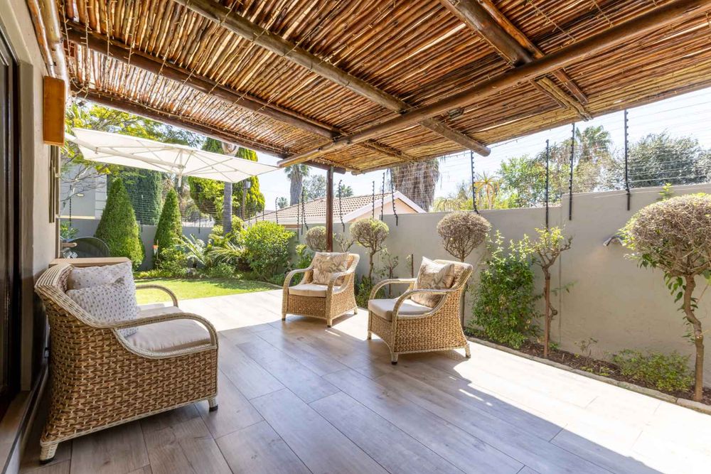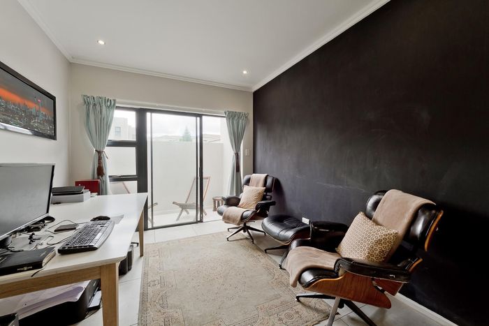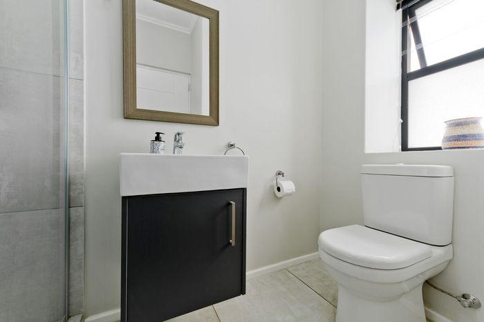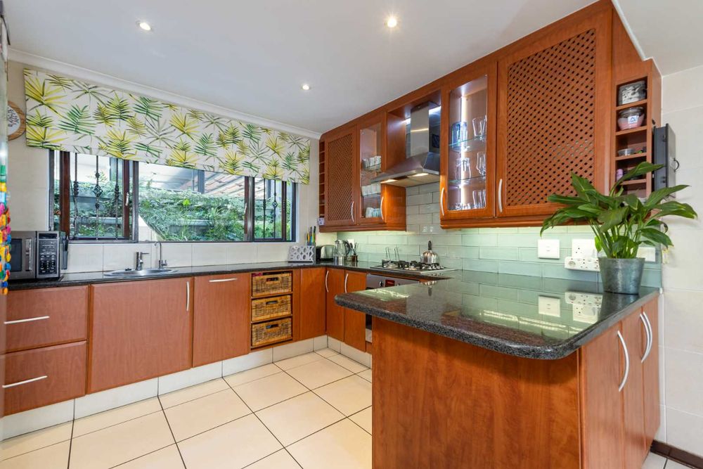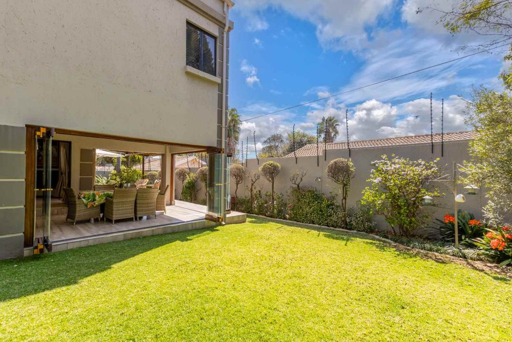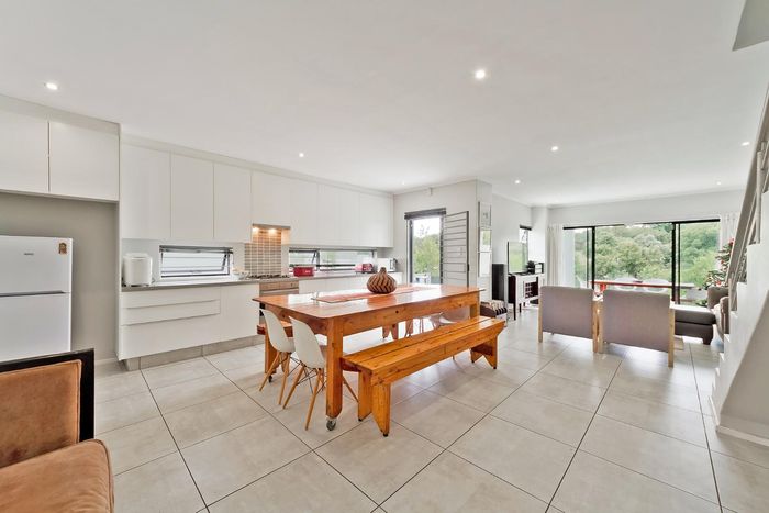 Welcoming light and bright entrance hall flows onto an open plan formal lounge and dining area with s gas fireplace, spilling onto a covered patio, overlooking the tree lined manicured irrigated garden. Family lounge boasts lots of natural light and also opens onto the patio area. Modern open plan kitchen with granite counter tops, prep bowl, breakfast bar, double door fridge space, gas hob with electric oven and extractor fan, separate scullery with under counter space for 3 appliances plus ample built-in cupboard space. The kitchen has a gorgeous irrigated vertical garden back drop - really eye-catching. A private study / playroom is tucked away and opens onto a section of the garden. A guest cloakroom and storage space under the staircase is neatly tucked away and completed the downstairs floor plan.