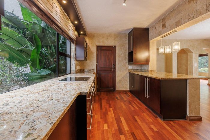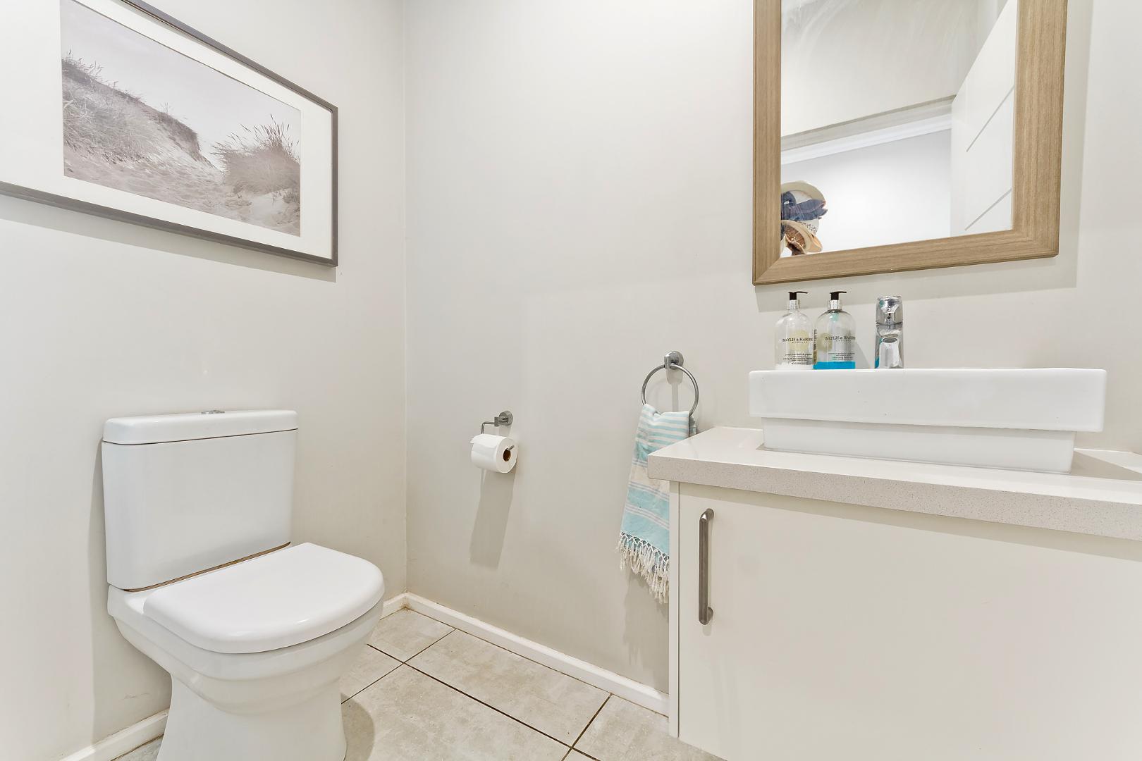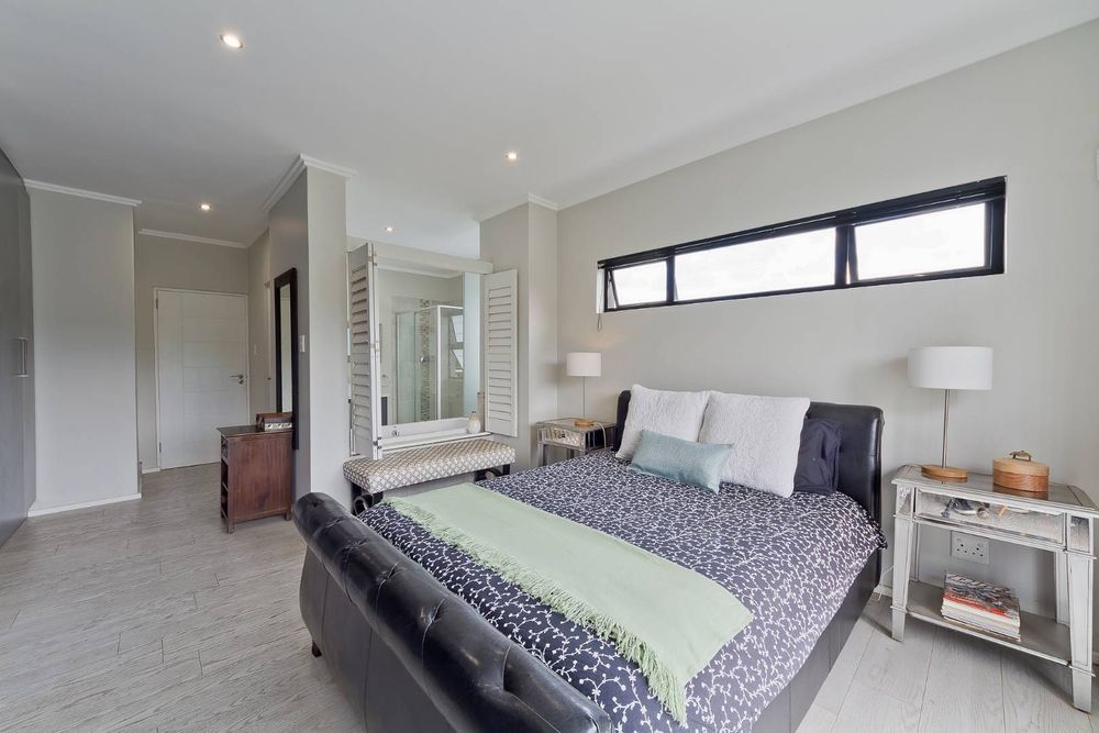 An inviting entrance hall flows onto an open plan lounge and eat-in kitchen spilling onto a covered patio overlooking the expansive wrap-around garden with a gorgeous riverfront view. Giving you a peaceful and tranquil outlook. Awe-inspiring open plan kitchen with Caesarstone counter tops, SMEG gas hob, single door fridge space, separate scullery area with under counter space for 2 appliances, plus ample cupboard space. The downstairs floor plan is complete with a guest cloakroom neatly tucked away.