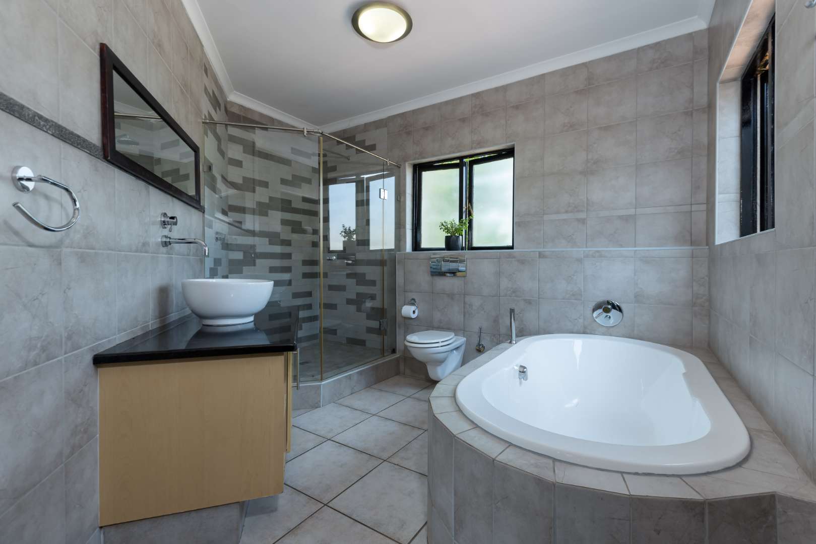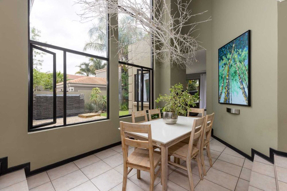 A welcoming feel will overcome you, the buyer, as you enter the front gate, with the beautifully landscaped garden. Upon entry through the front door, you will be lead to a double volume open plan dining area, which boasts the most spectacular chandelier and expansive windows that allows for loads of natural light. The open plan lounge area opens onto the garden overlooking the sparkling swimming pool. The feature wall with wood burning fireplace, separates the lounge and dining area. Open concept kitchen with granite counter tops, breakfast nook, space for 3 under counter appliances, double door fridge space, separate scullery area, walk-in pantry, plus ample cupboard space. The downstairs floor plan is completed with a guest bedroom plus a perfect flatlet with its own separate entrance, kitchenette and bathroom with a shower that is situated in a quiet and peaceful part of the home.