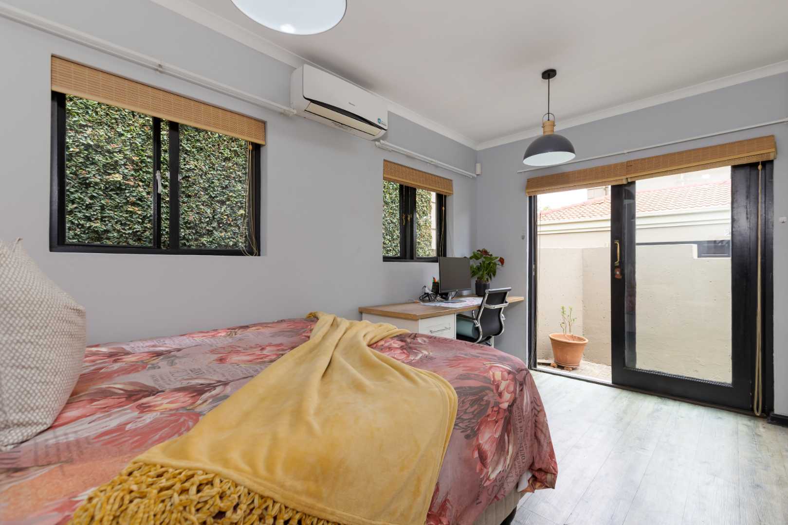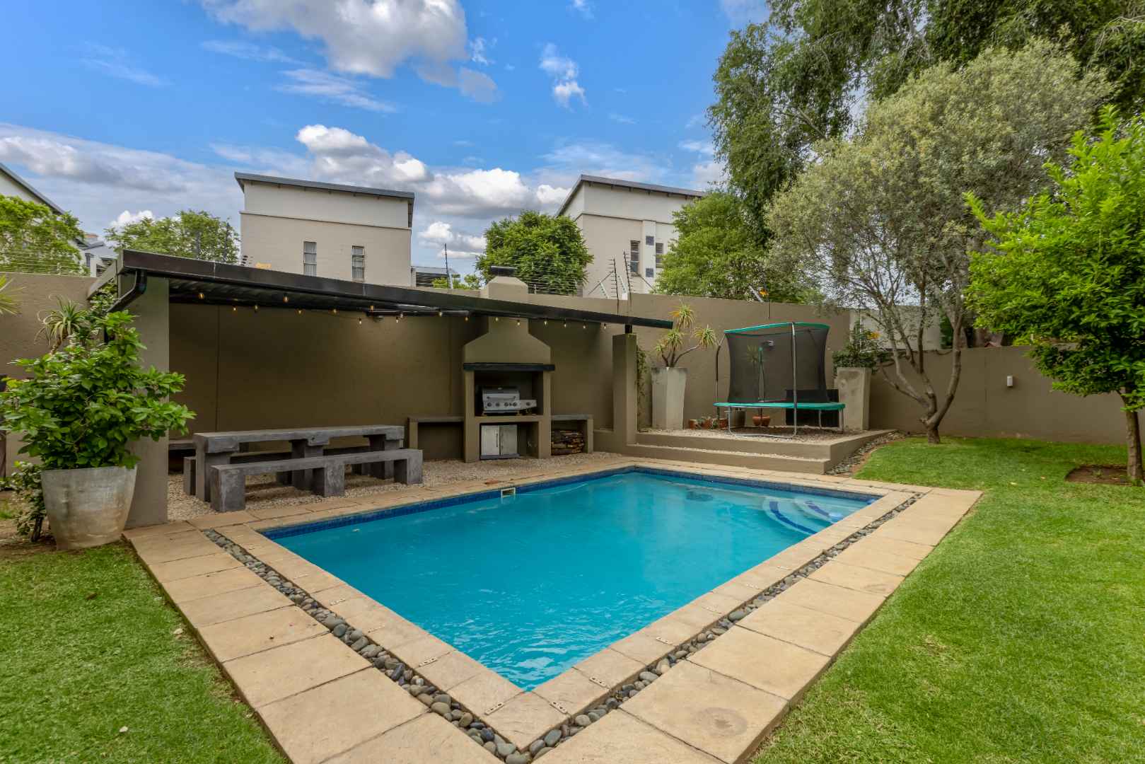 The private wrap-around garden has an automated irrigation system and a separate entertainers area with a built-in braai under a covered structure.