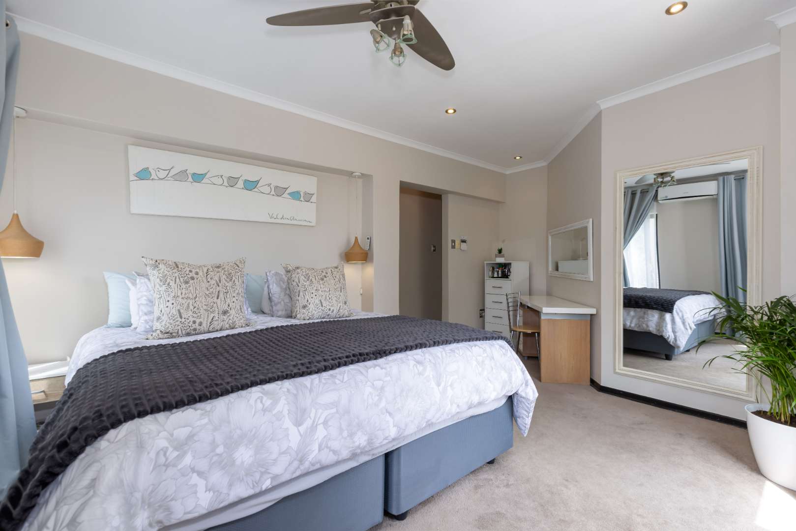 3 Sun-drenched bedrooms with carpets are upstairs, with the main bedroom opening up onto a balcony with the most stunning views of the garden below. The main bedroom boasts a walk-in dressing area and full en-suite bathroom with a corner bath, seamless shower plus a double vanity. An additional full bathroom services the other 2 bedrooms. YES THIS HOME HAS 5 BEDROOMS.