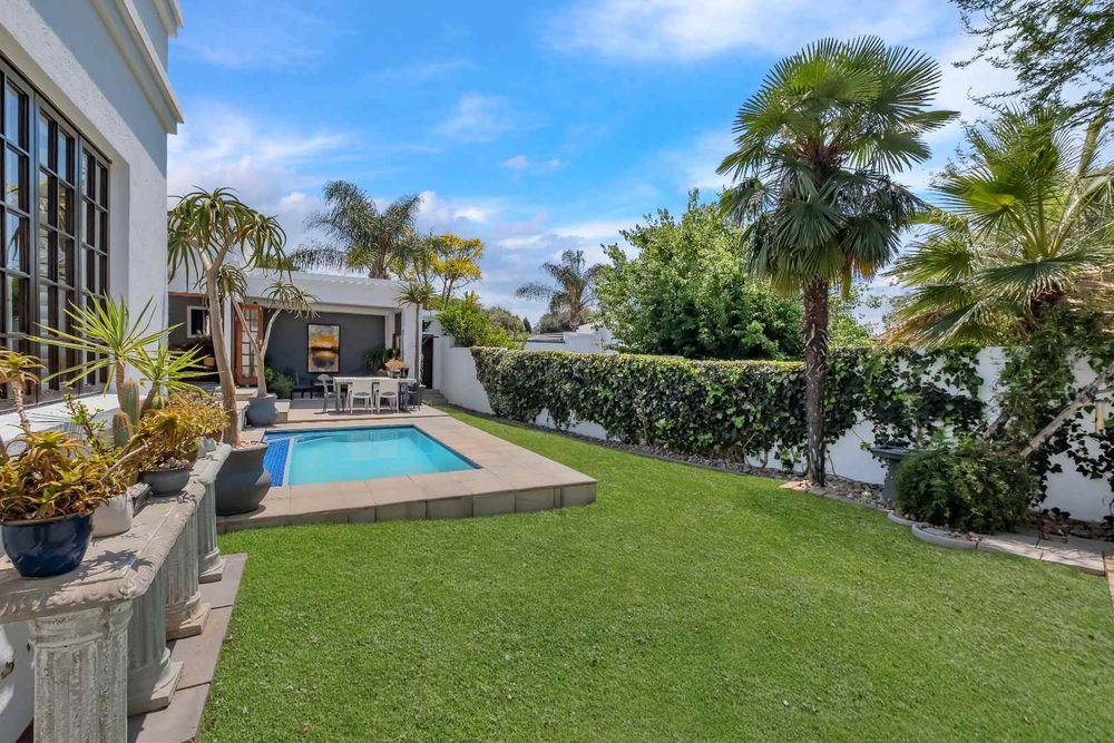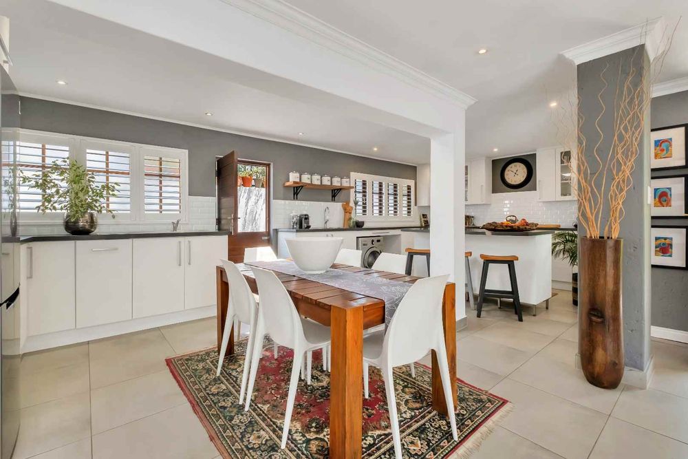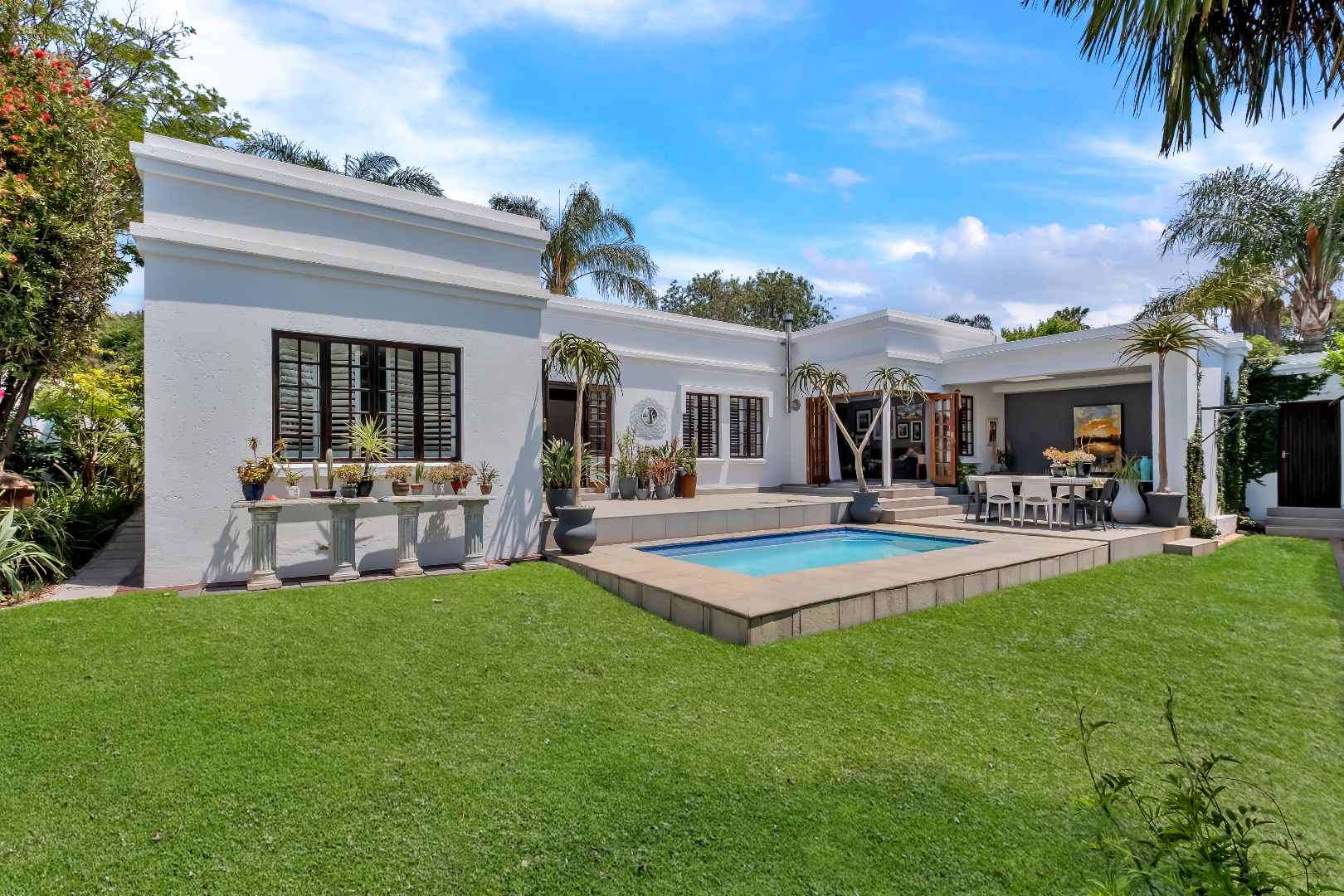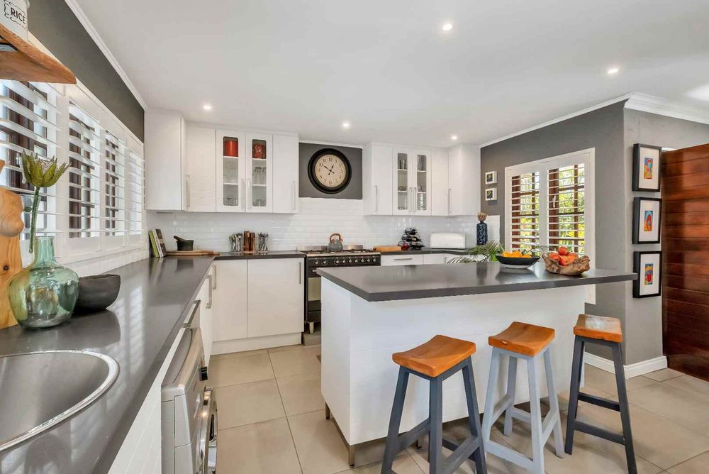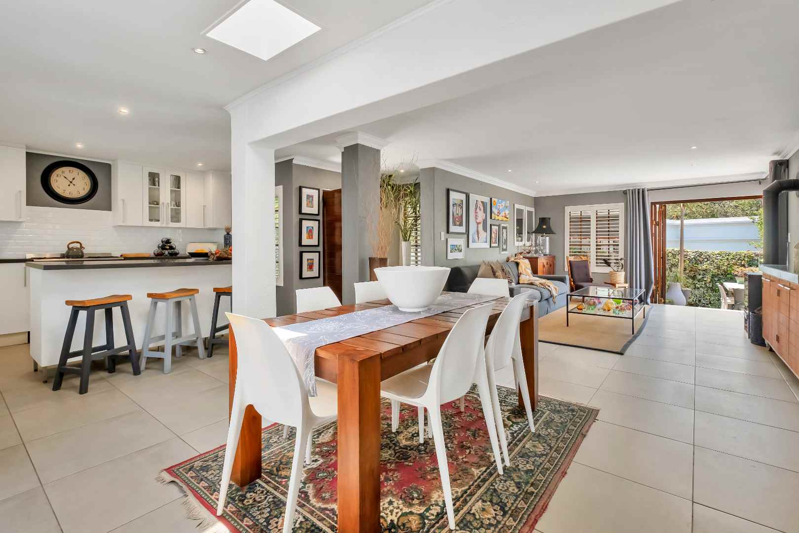 A welcoming entrance flows onto a sizeable open concept family lounge and dining area boasting a feature wood burning fireplace - this area spills onto an open and covered patio, overlooking the peaceful wrap-around garden and sparkling swimming pool. The dining area is conveniently located adjacent to the open plan kitchen. This home is brilliantly flexible for both indoor and outdoor living and entertaining. Open concept cutting-edge kitchen boasts Caesarstone countertops, a breakfast bar / centre island, SMEG gas hob with electric oven, under counter space for 2 appliances, a single door fridge space, plus ample built-in cupboards.