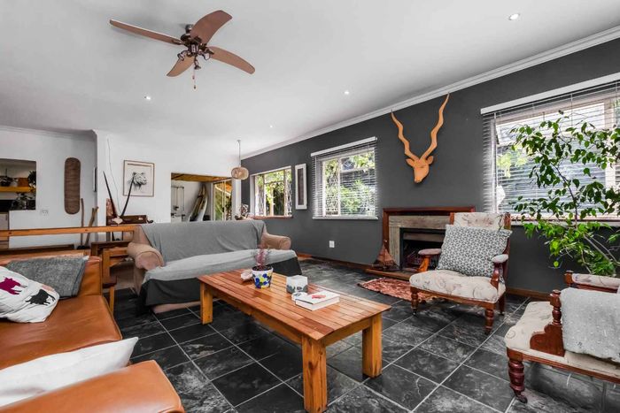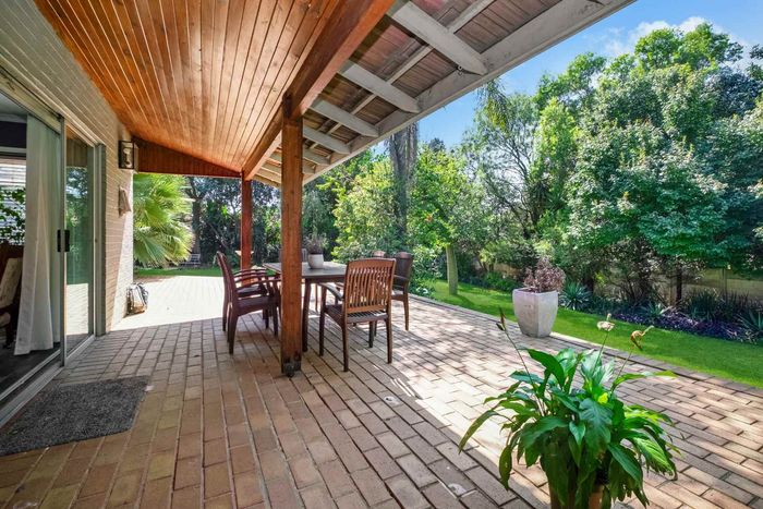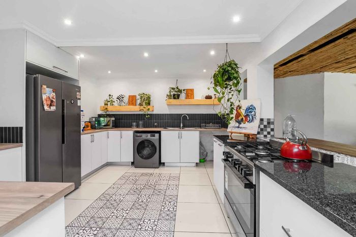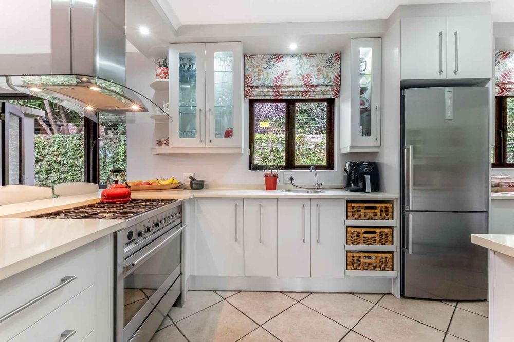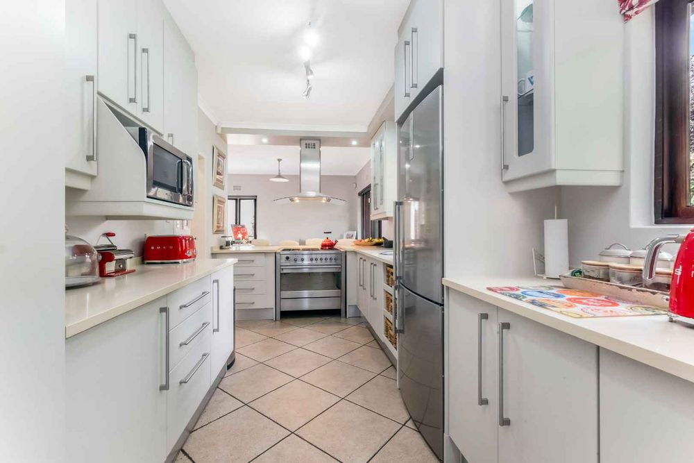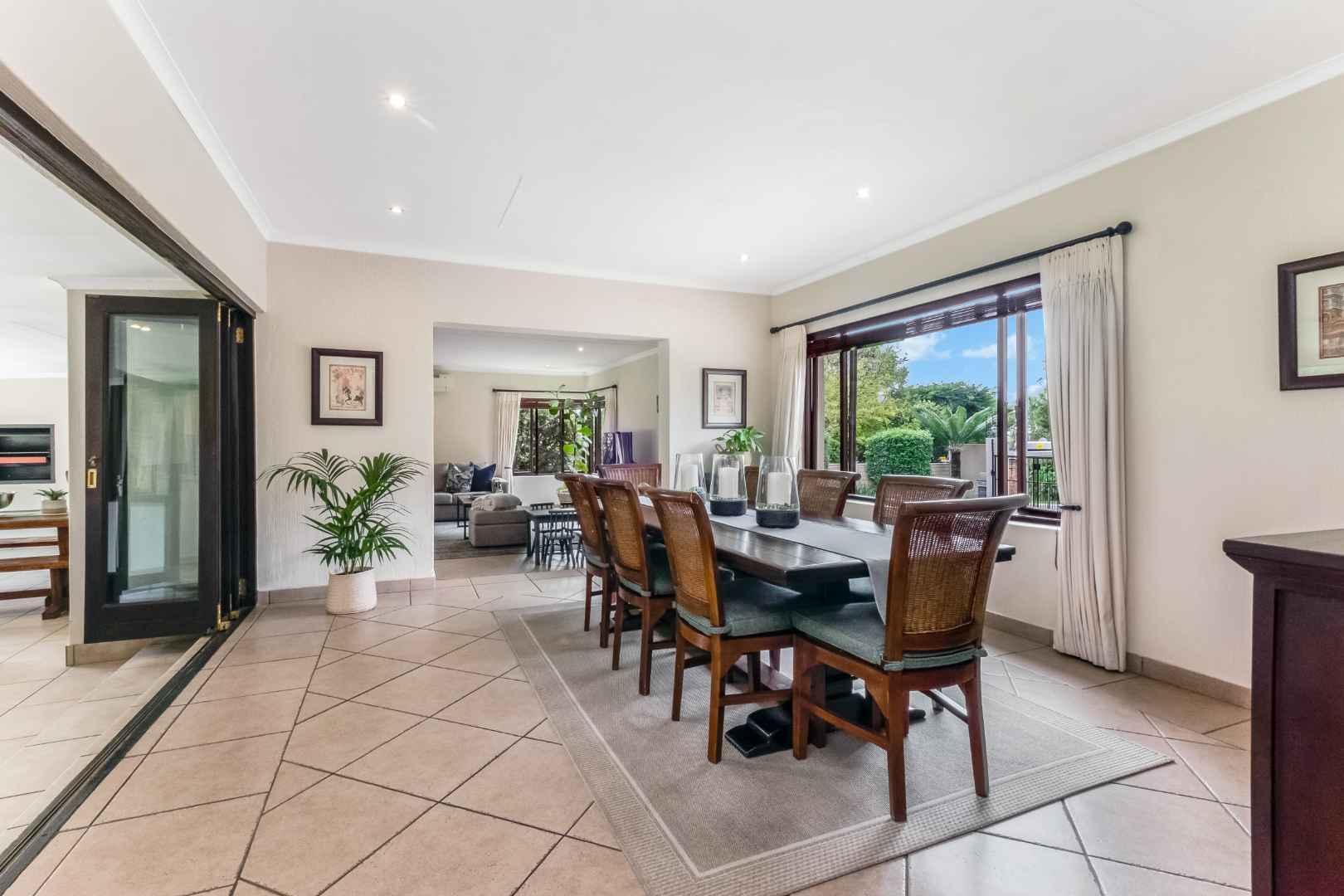 Welcoming light and bright entrance hall, will lure you onto an open plan family lounge and dining area with a feature wood burning fireplace, spilling onto the expansive enclosed entertainers patio with a built-in braai and fitted bar area, overlooks the irrigated garden and sparkling heated swimming pool, this an ideal space for indoor/outdoor entertaining. A cosy family breakfast nook is adjacent to the awe-inspiring open plan kitchen with Caesarstome countertops, SMEG gas hob with electric oven with extractor fan, double door fridge space, prep-bowl, separate scullery area that can accommodate all your appliances, plus ample cupboards space. The kitchen opens onto a quaint little courtyard making this a lovely bright and breezy space to have a potted herb garden. A tucked away study or 4th bedroom is on the wing where the reception areas are plus a guest cloakroom.