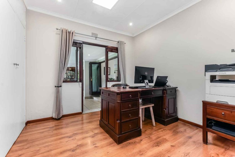 This family haven offers the following: Triple automated garages with ample storage space, ample parking space for your visitors, security alarm system plus electric fencing, partial air-conditioning, solar geyser, an inverter back-up plus 24 panels and a lithium battery, borehole water plus 5000 litre backup tank and a filtration systems with ultraviolet light, plus the home is fibre enabled.
