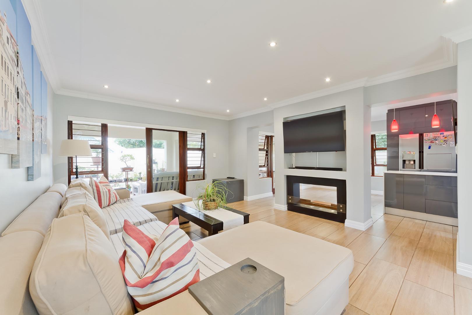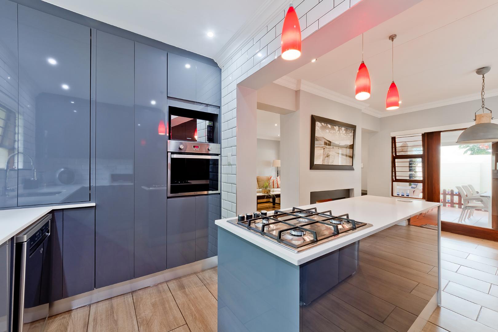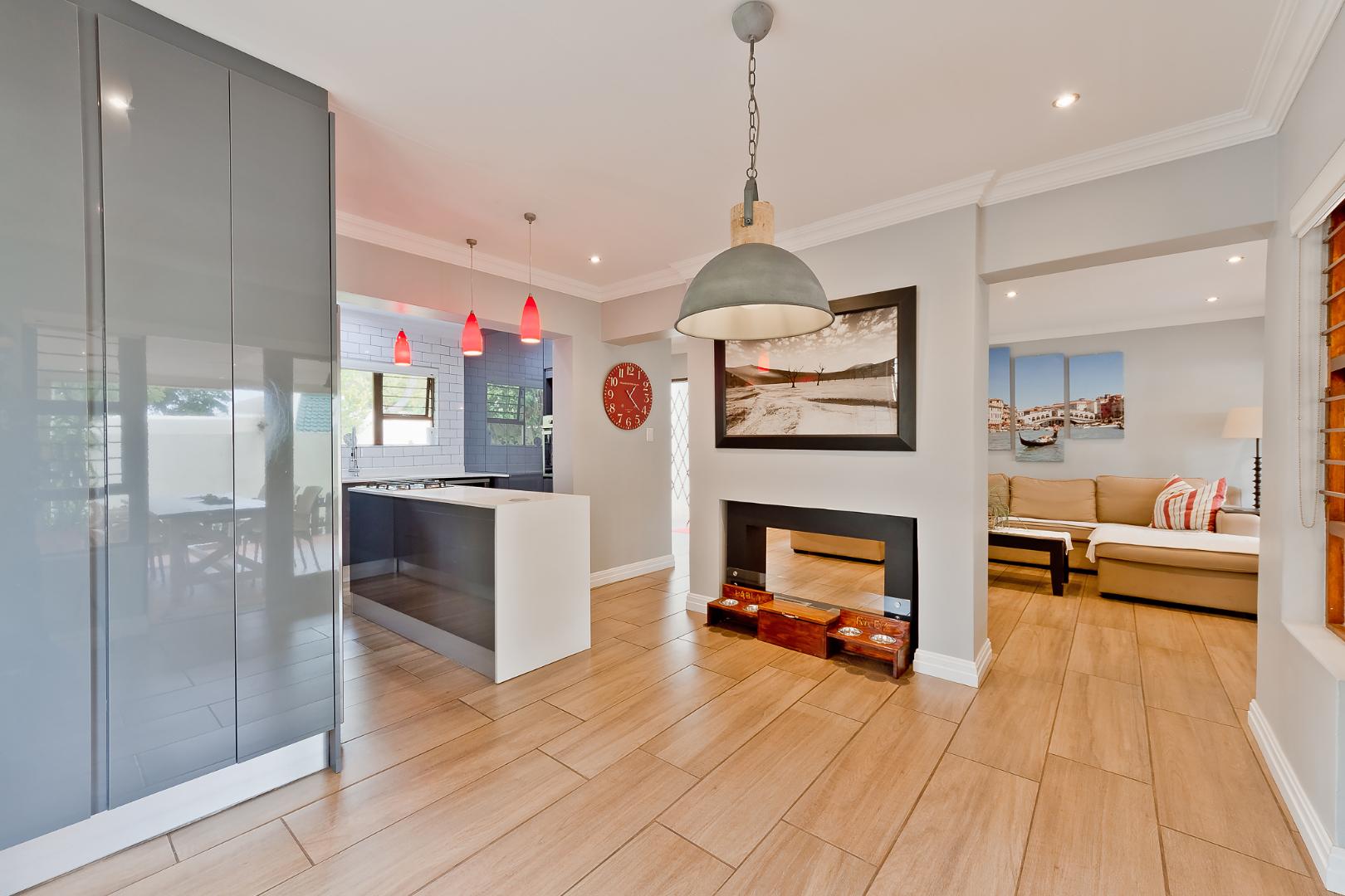 Cosy and chic modern open plan tiled family lounge and dining area, spilling onto a double covered patio, overlooking the decked heated swimming pool and wrap-around garden. Cutting edge modern open plan kitchen with Caesarstone counter tops, centre island with gas hob, eye-level oven, plumbed double door fridge space and ice-maker, under counter space for 1 appliance, plus ample soft touch built-in cupboard space.