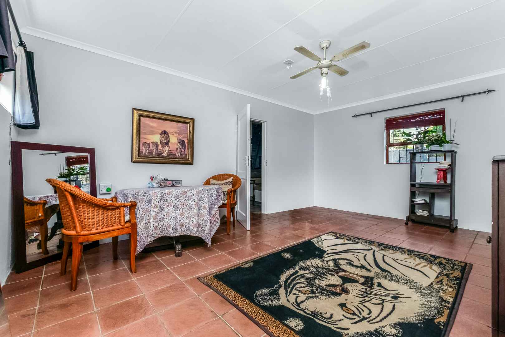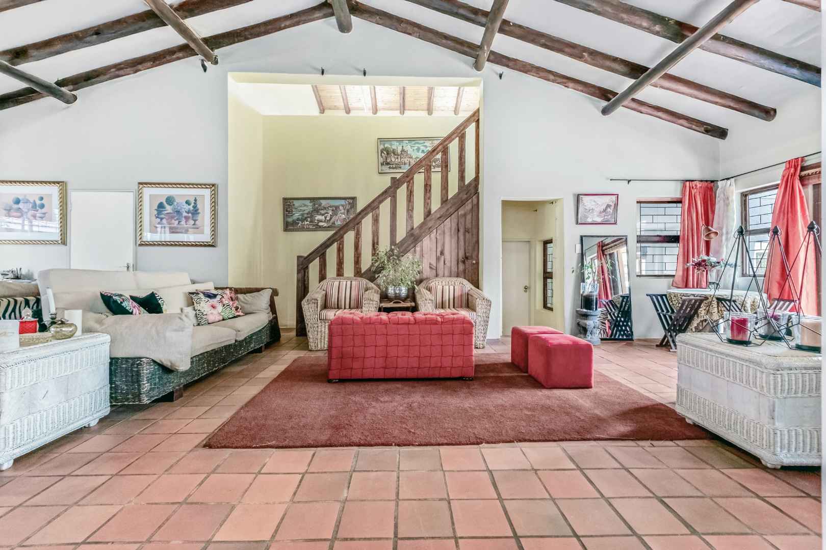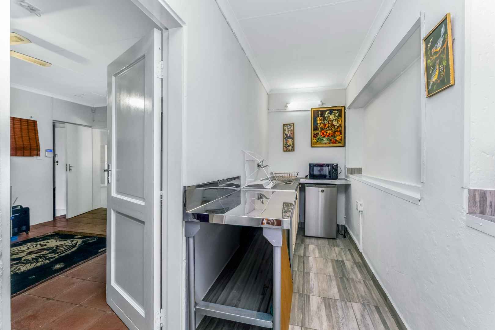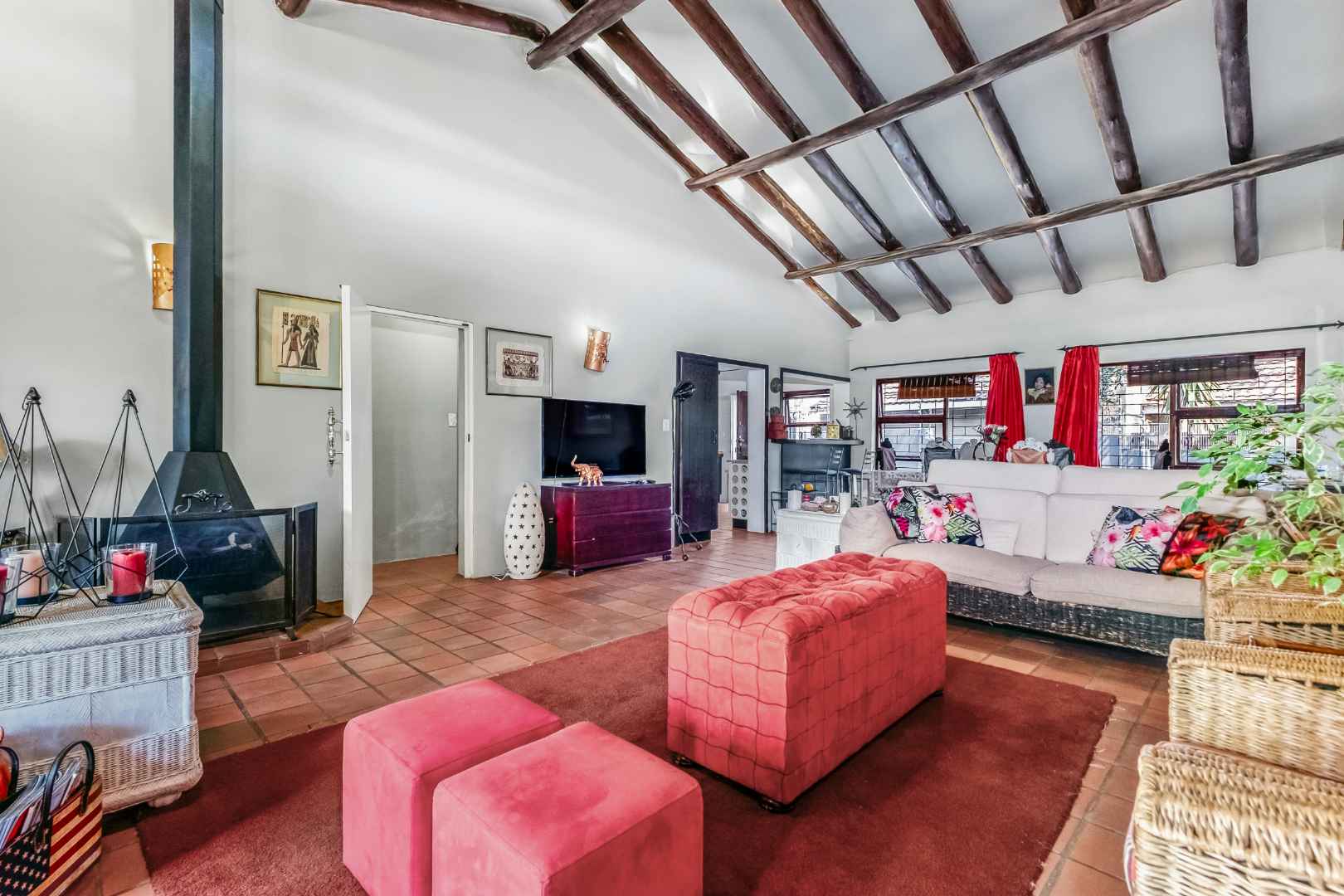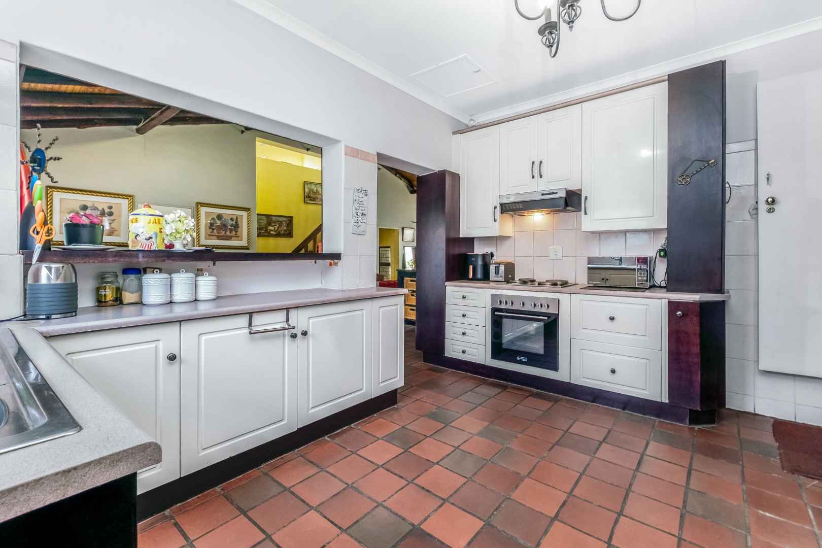 A welcoming entrance hall flowing onto an open plan family lounge and dining area, spilling out onto an open courtyard, overlooking the wrap around garden. Open plan functional kitchen with electric stove and oven plus extractor fan, under counter space for 3 appliances, pantry cupboard, single door fridge space, plus ample built-in cupboards.