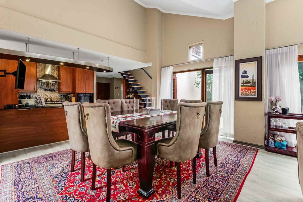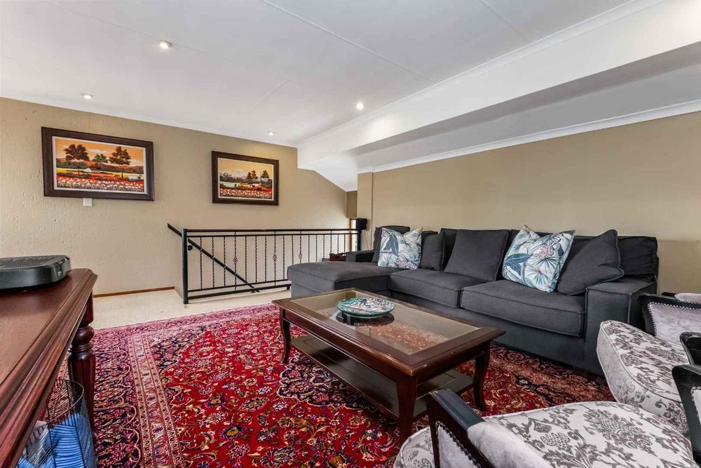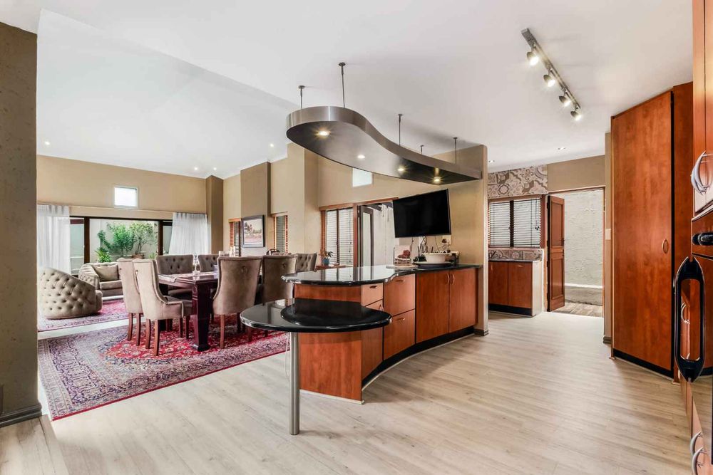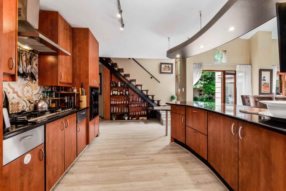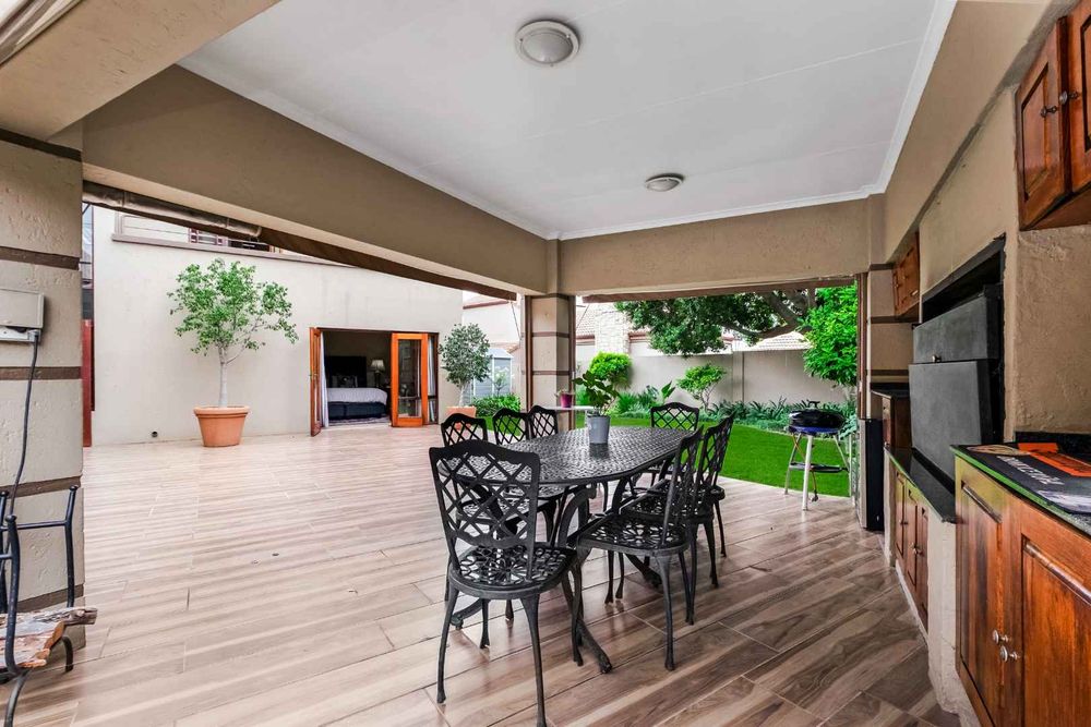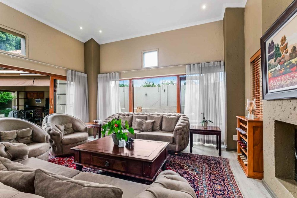 A welcoming entrance lures you onto a flexible entertainers dream layout. Open plan formal lounge and dining area with double volume ceilings and a wood burning feature fireplace, spills onto a entertainers patio, overlooking the manicured irrigated garden and sparkling solar heated decked swimming pool - offering the utmost privacy. A covered patio section with fitted rollable blinds and retractable awning is ideal to host family and friends all year round, plus it has a built in wood burning braai area. This home is fabulous as it leans towards indoor/outdoor living, something that we love doing. The open concept kitchen is ideal for entertaining and boasts granite countertops, a breakfast nook, water filtration system, gas hob with extractor fan and eye-level oven, double door fridge space, separate scullery with under counter space to accommodate your appliances, plus ample built-in cupboard space.