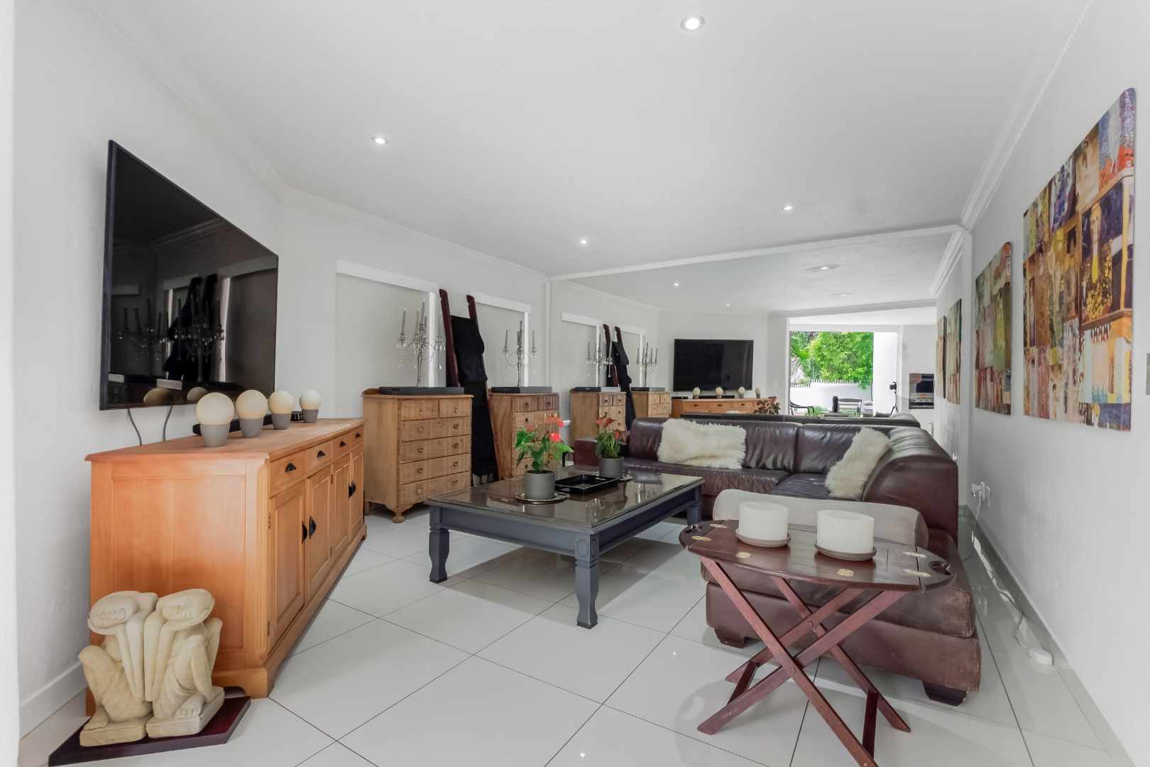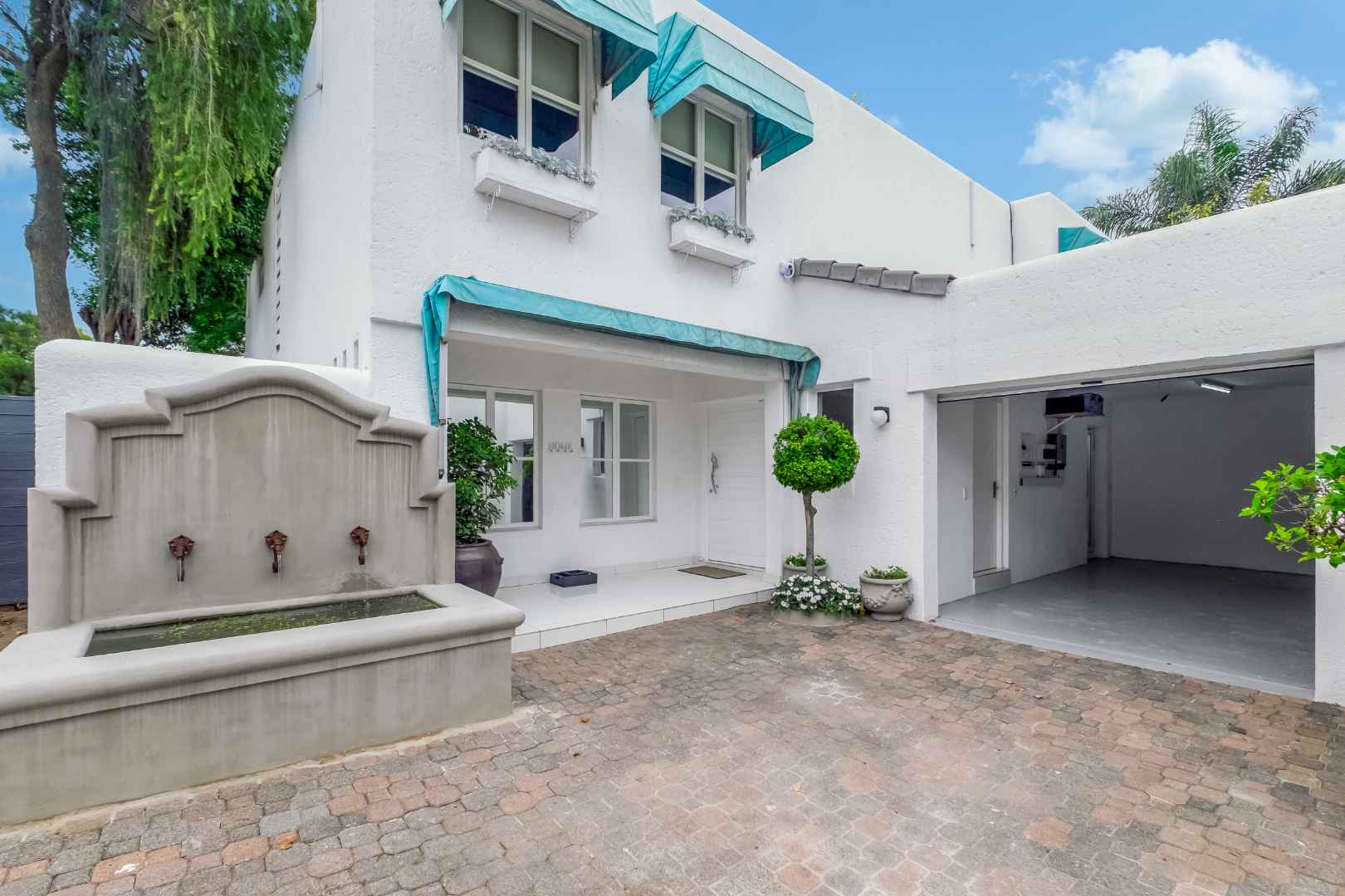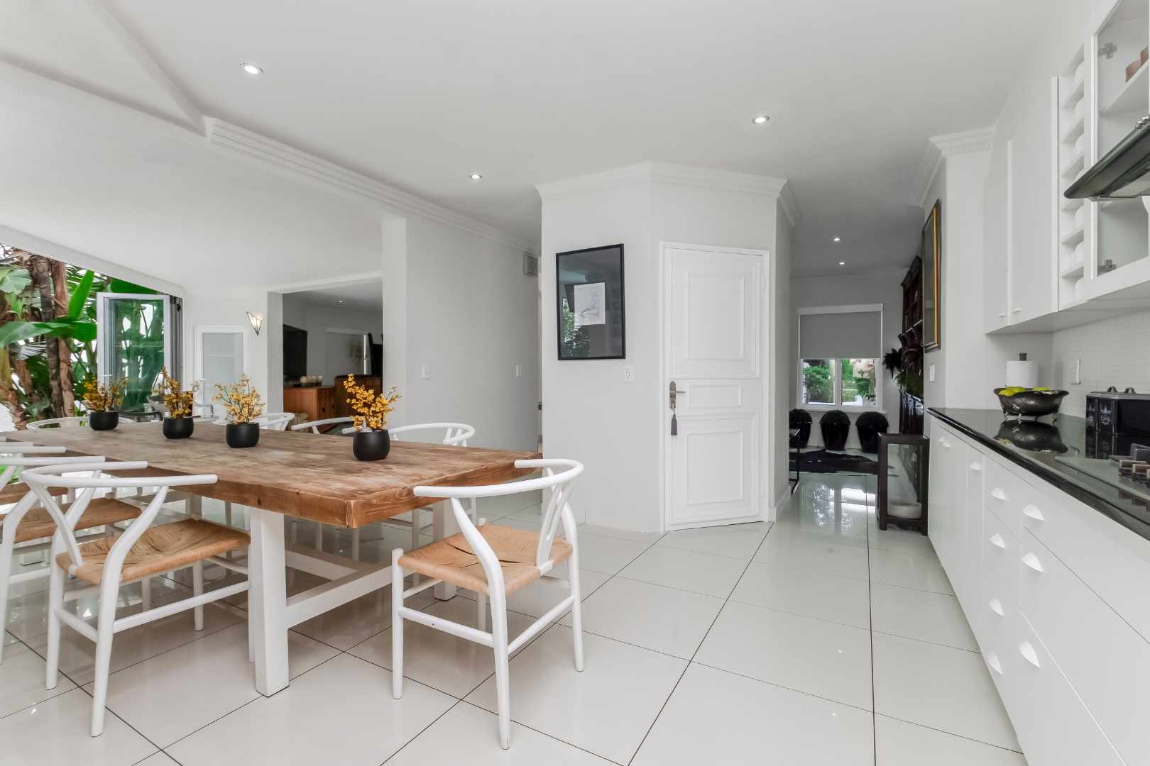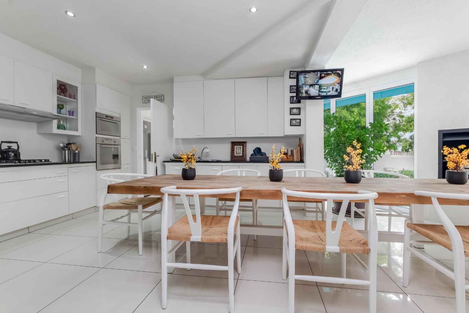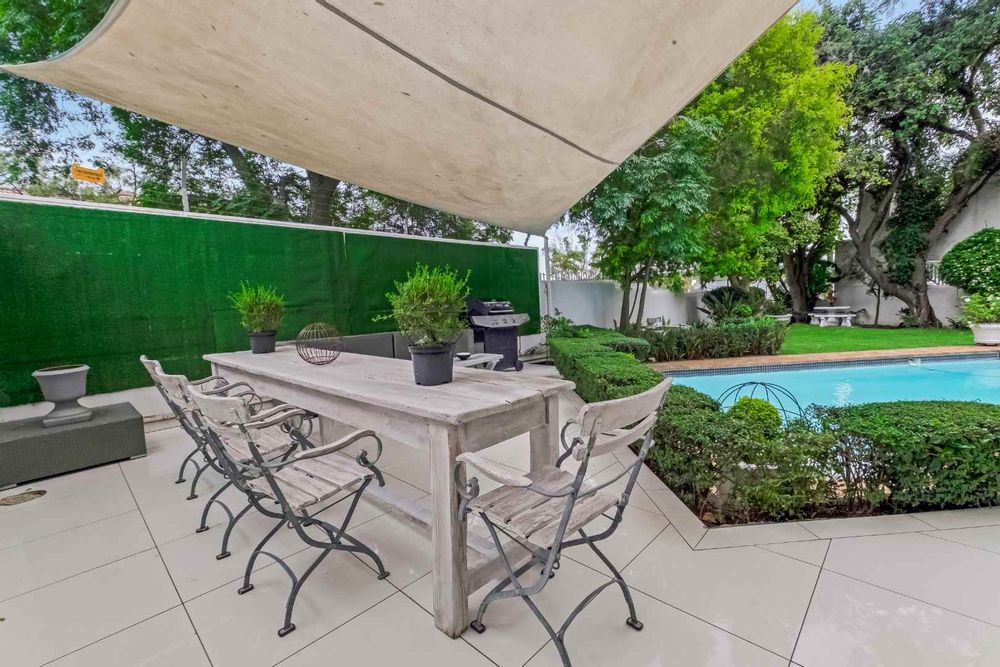 Upon entering the inviting double volume entrance to this beautiful cluster home, a sense of peace and privacy will overcome you. Open plan mirrored formal and family lounge spills out onto the meticulously cared for irrigated garden and sparkling swimming pool. The dining area is adjacent to the kitchen, making entertaining a dream. Cutting edge open plan kitchen with Caesarstone countertops, centre-island with breakfast bar, walk-in pantry with chalkboard door, gas hob, eye-level oven, prep bowl, double door fridge space, separate scullery with under counter space for 3 appliances plus loads of cupboards. Guest cloakroom is neatly tucked away.