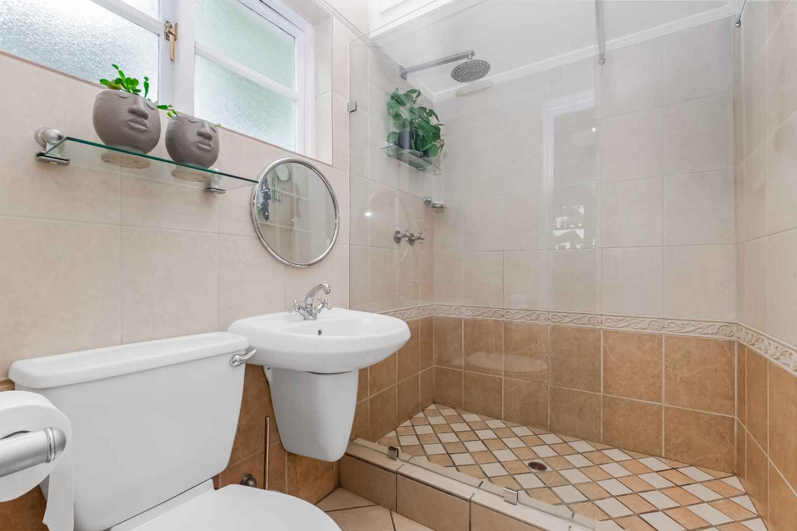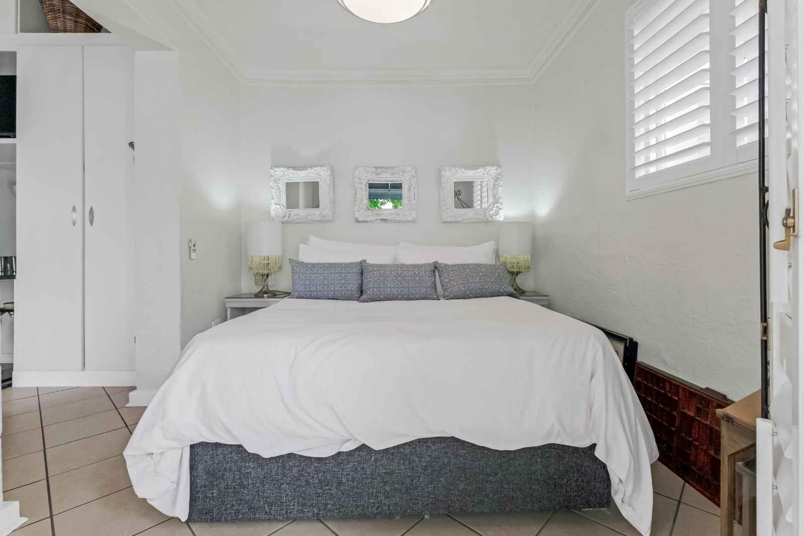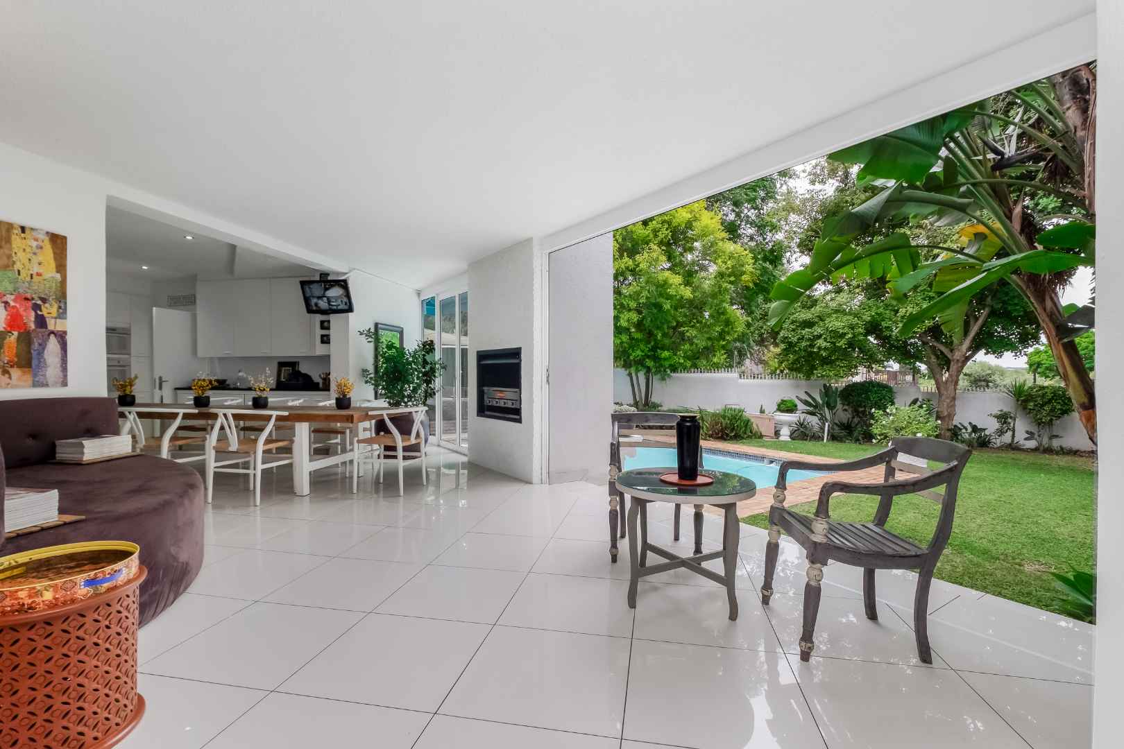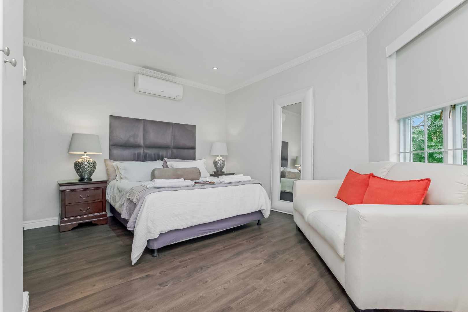 Upon entering the inviting double volume entrance to this beautiful cluster home, a sense of peace and privacy will overcome you. Open plan mirrored formal and family lounge spills out onto the meticulously cared for irrigated garden and sparkling swimming pool. The dining area is adjacent to the kitchen, making entertaining a dream. Cutting edge open plan kitchen with Caesarstone countertops, centre-island with breakfast bar, walk-in pantry with chalkboard door, gas hob, eye-level oven, prep bowl, double door fridge space, separate scullery with under counter space for 3 appliances plus loads of cupboards. Guest cloakroom is neatly tucked away.