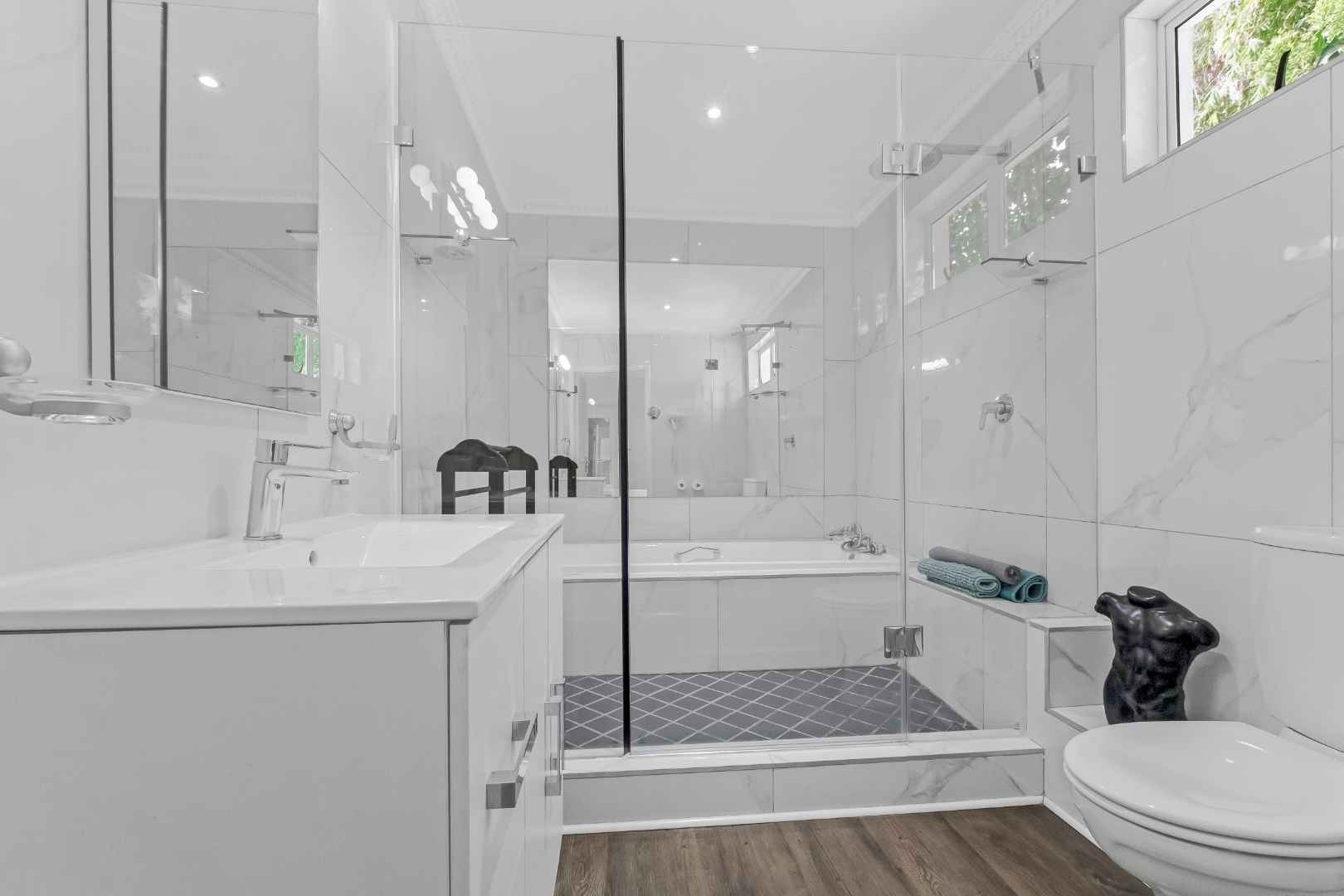 Upstairs boasts 3 sun-filled bedrooms, all with laminate flooring, air-conditioning, full en-suite bathrooms plus fitted hair-dryers (MES). The master bedroom is bright and breezy spilling onto a balcony overlooking the treetops of the garden below, a space that can be enjoyed all year round. The en-suite bathroom boasts double vanities. The upstairs floor plan is complete with an open plan study/work from home space.