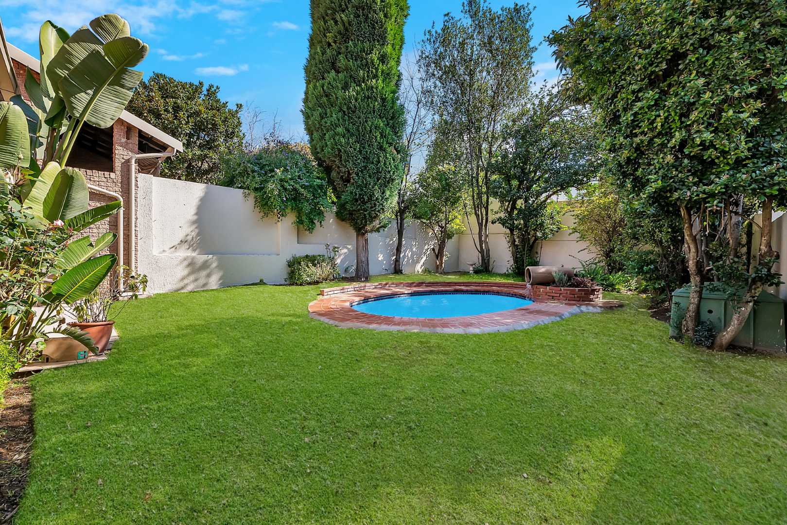 Very private, manicured garden with a covered patio that overlooks the sparkling swimming pool.