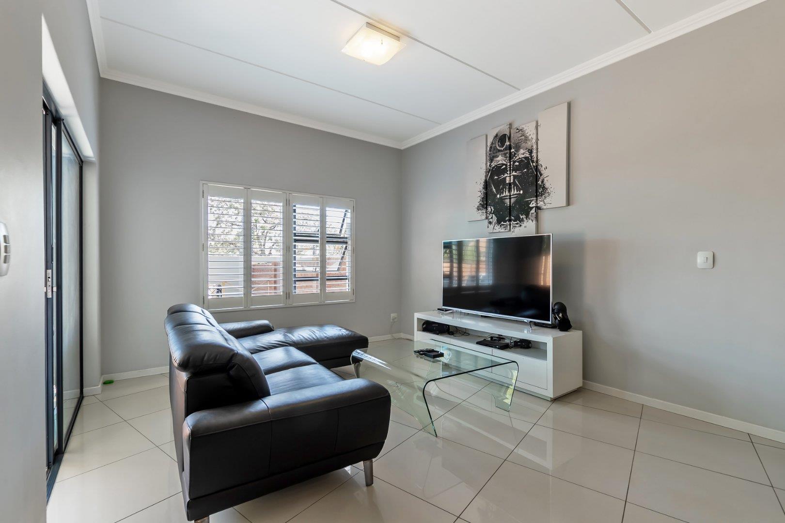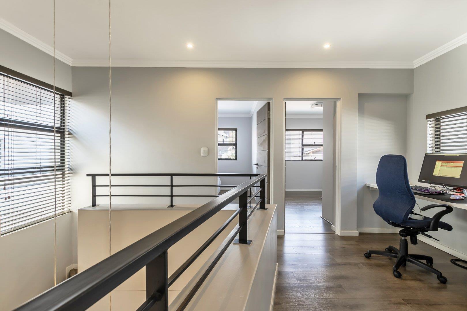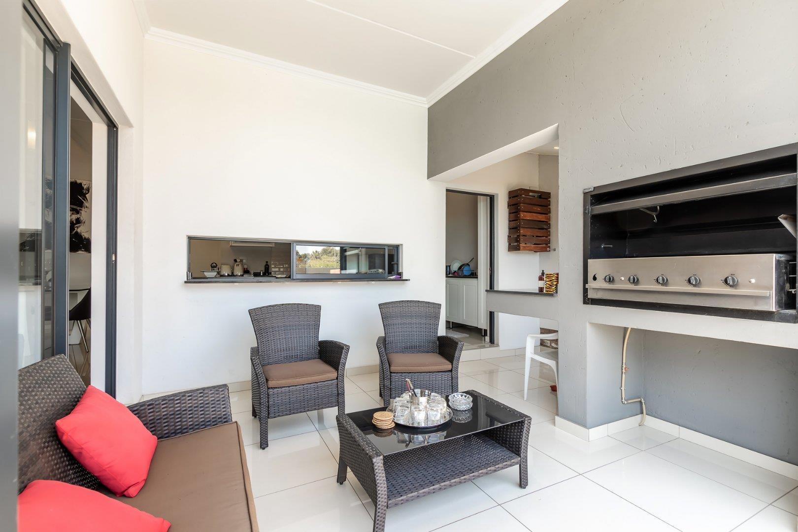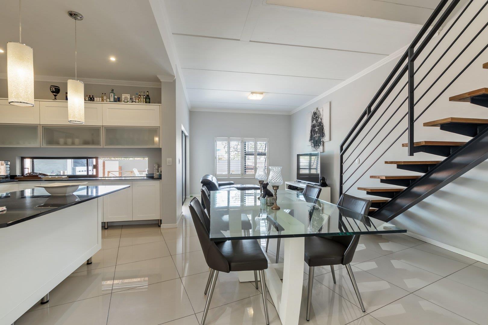 This freestanding cluster in the highly desirable complex of Villa Sao Pedro offers secure-estate living while still being able to enjoy a private home. The top floor boasts three spacious bedrooms, two sleek bathrooms and a work from home study space. The ground floor offers an open-plan living and dining area with a real heart of the home kitchen, and for the entertainers, a fully enclosed patio with a built-in gas braai that leads out onto a spacious wooden deck area. A real layer of luxury over an already charming and modern 3 bedroom unit of rare quality, and to top it all off; there is a 5KVA inverter that can power the home for 5 days, American shutters throughout as well as a gas braai, gas stove and gas geysers so load shedding won't be a problem and finally a double garage with additional storage space.
