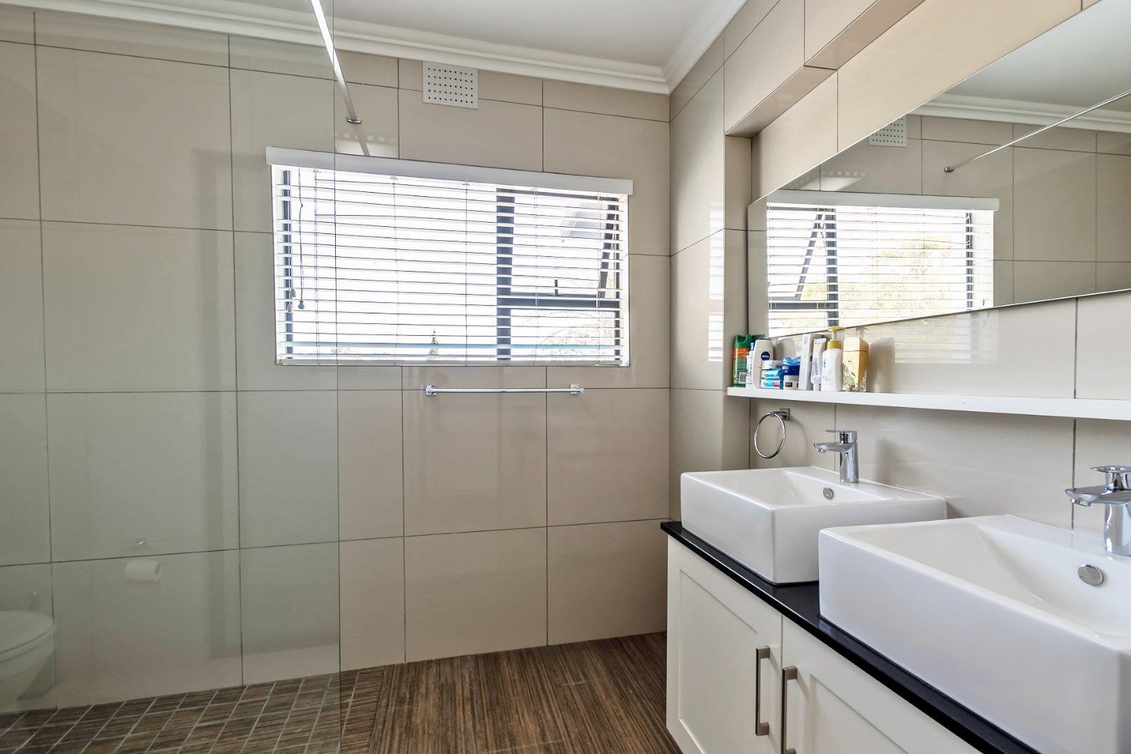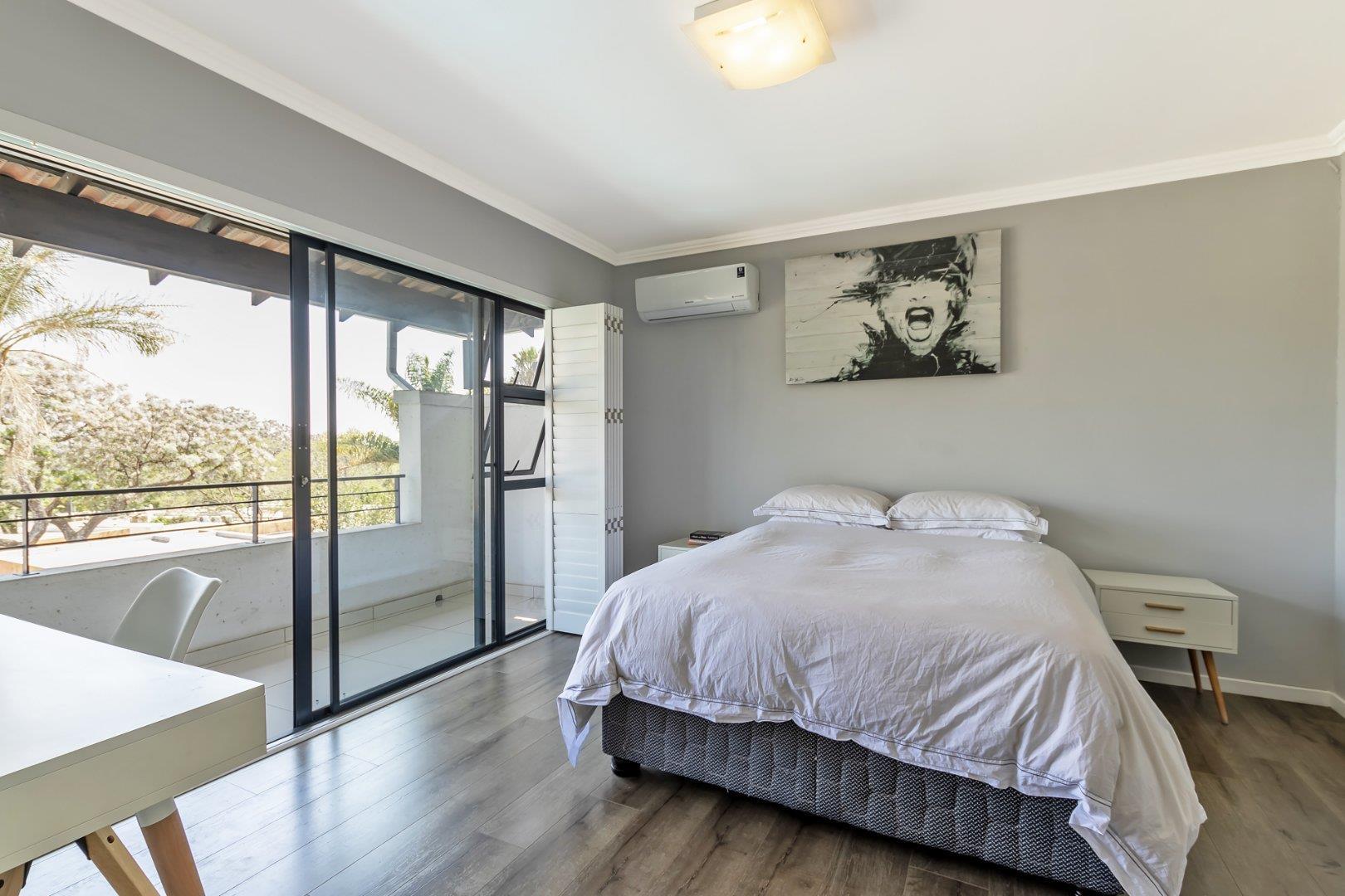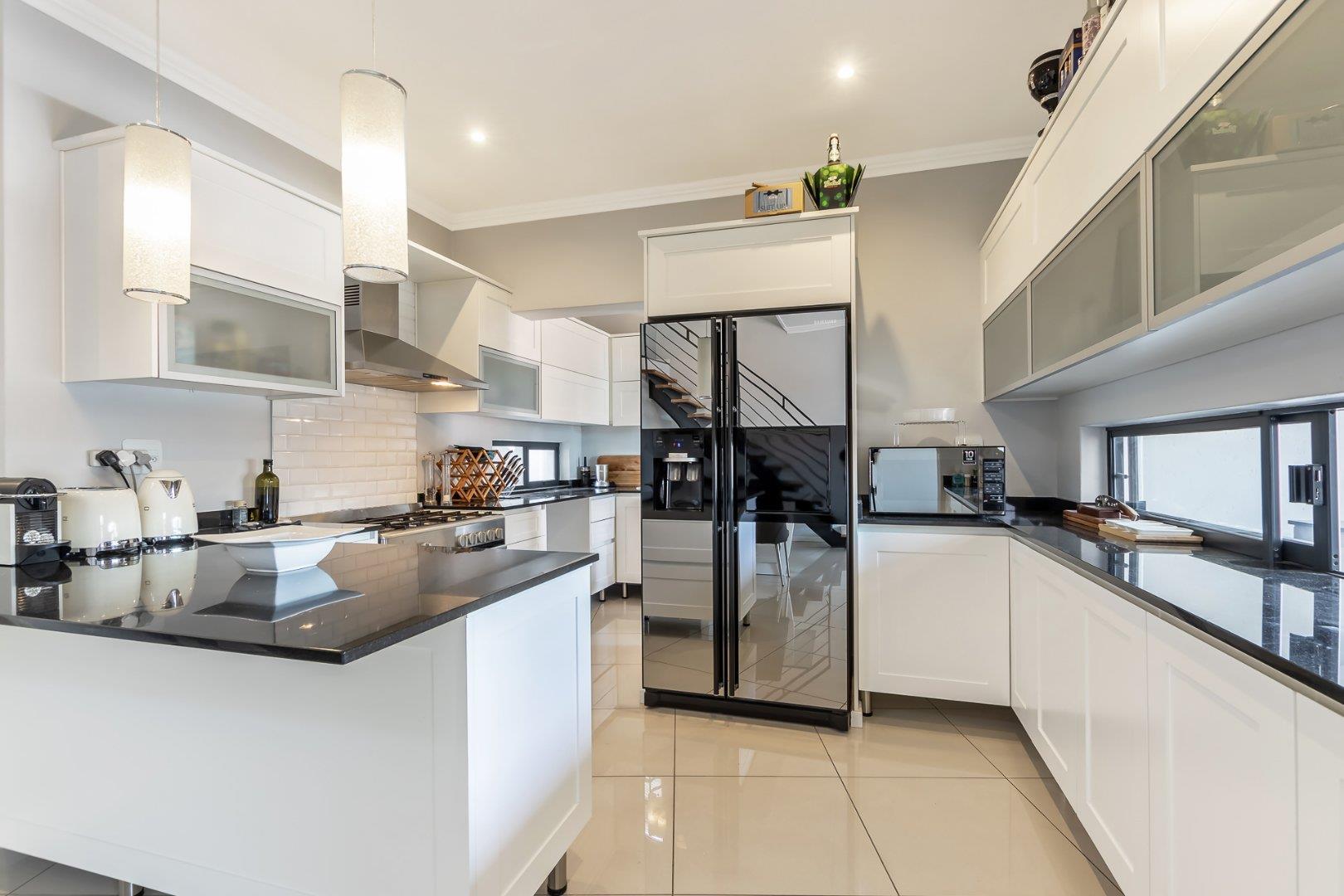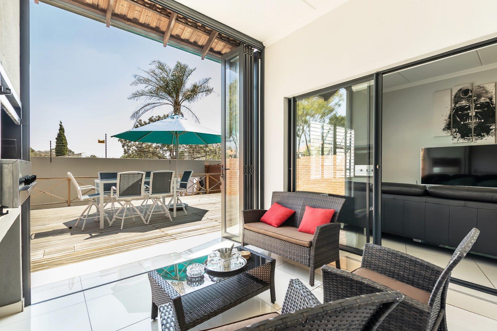 This freestanding cluster in the highly desirable complex of Villa Sao Pedro offers secure-estate living while still being able to enjoy a private home. The top floor boasts three spacious bedrooms, two sleek bathrooms and a work from home study space. The ground floor offers an open-plan living and dining area with a real heart of the home kitchen, and for the entertainers, a fully enclosed patio with a built-in gas braai that leads out onto a spacious wooden deck area. A real layer of luxury over an already charming and modern 3 bedroom unit of rare quality, and to top it all off; there is a 5KVA inverter that can power the home for 5 days, American shutters throughout as well as a gas braai, gas stove and gas geysers so load shedding won't be a problem and finally a double garage with additional storage space.