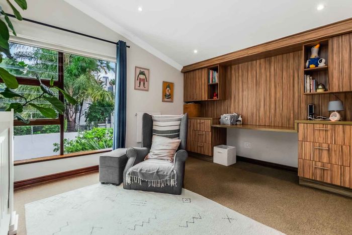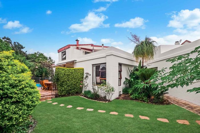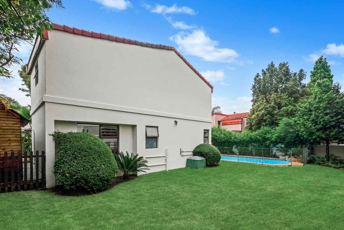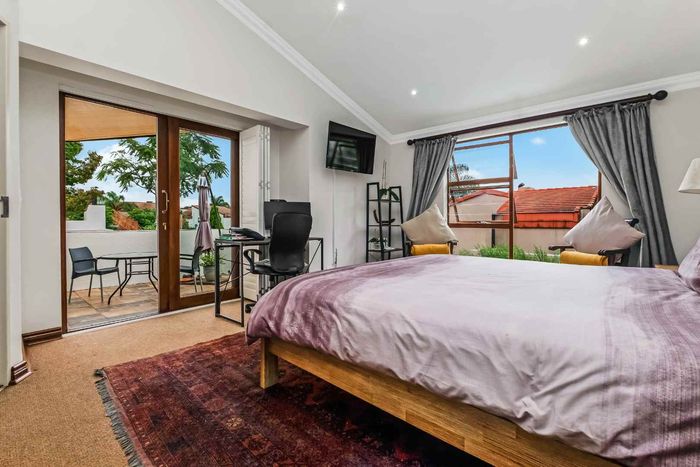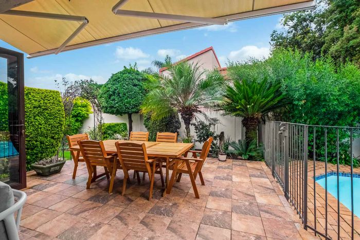 Entertainer's paradise in Fourways Gardens lifestyle estate, steps from clubhouse and amenities, featuring a roof-garden patio and expansive poolside garden; versatile fourth-bedroom studio, four beds, double garage.