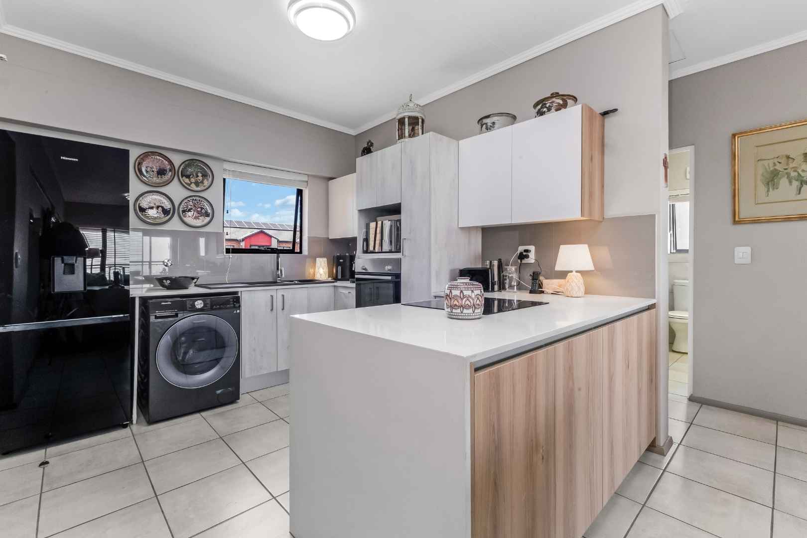 An inviting entrance flows onto a delightful open plan lounge and dining area, spilling out onto a covered balcony . Brilliantly flexible, perfect for outdoor / indoor enjoyment. Cutting edge open plan kitchen with Caesarstone countertops, breakfast bar, 4 electric stove and oven, under counter space for 2 appliances, single door fridge space plus ample built-in cupboards.