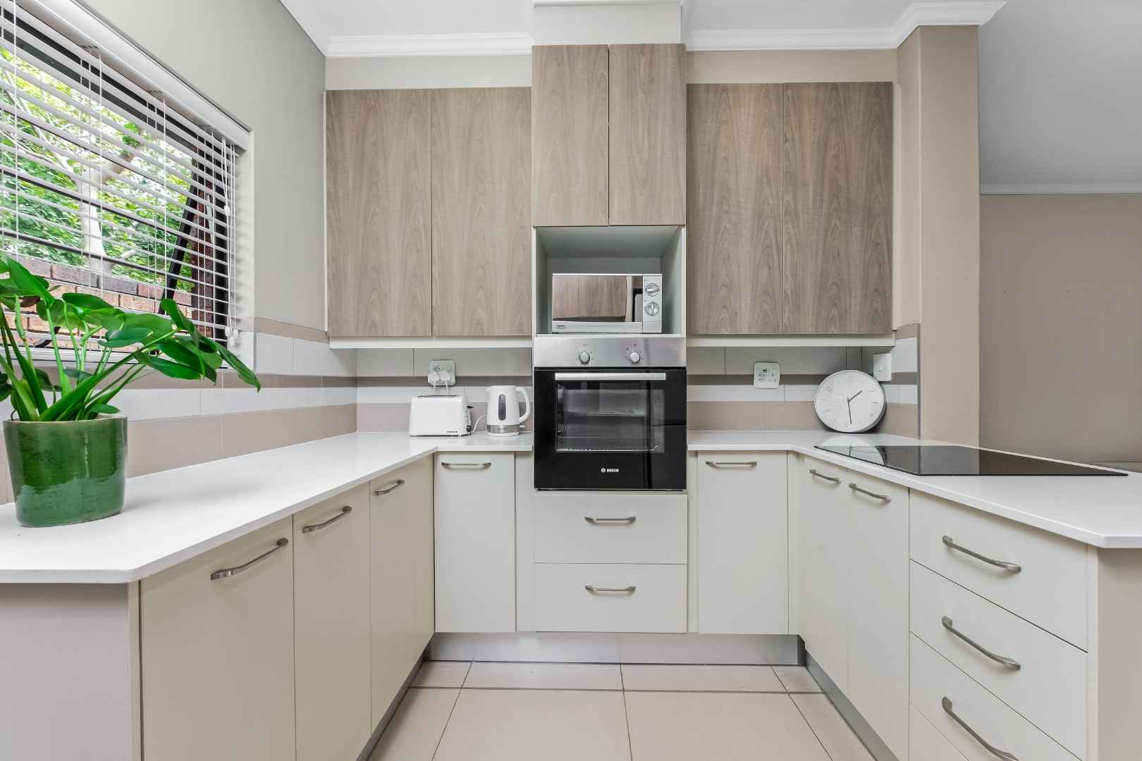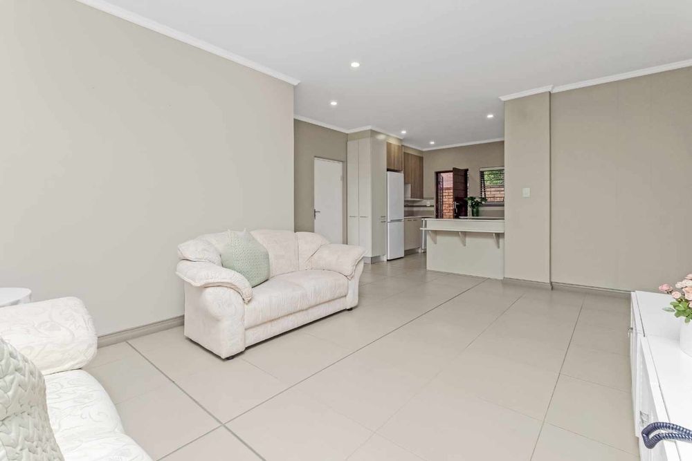 The welcoming entrance flows onto an open plan family lounge, spilling onto an enclosed patio with aluminium stacking doors, spilling onto the manicured private garden. The dining area is adjacent to the kitchen with Caesarstone countertops, electric stove and oven plus extractor fan, single door fridge space, under counter space to accommodate 2 wet appliances, plus ample built-in cupboards.