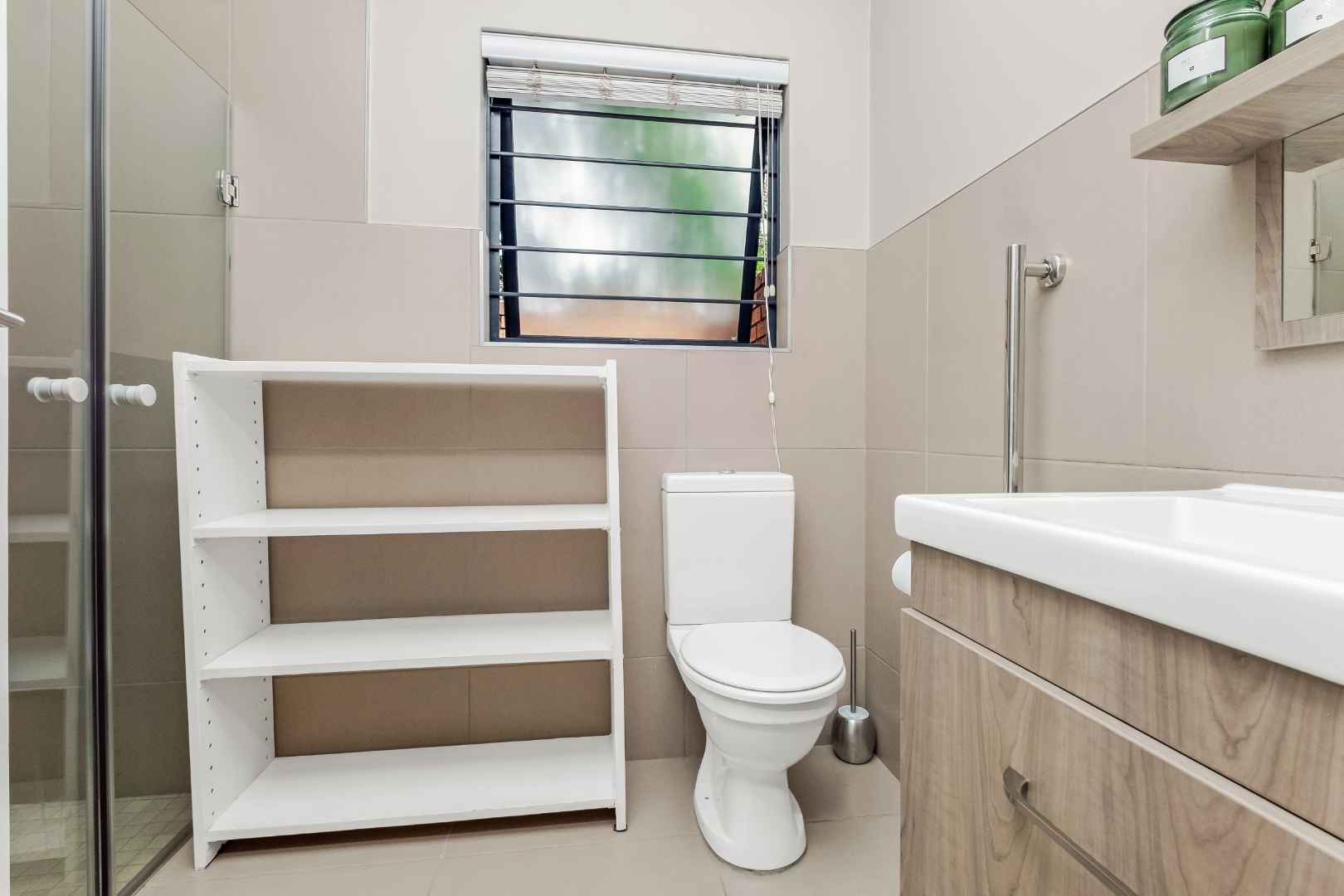 3 Delightfully sized carpeted bedrooms boasting ample built-in cupboard space and 2 bathrooms (MES). The sun-dappled master bedroom has a pretty outlook of the private garden and has a en-suite bathroom.