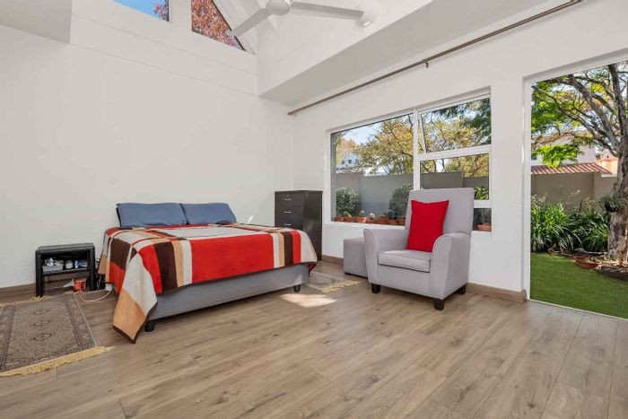 Entertainer's single-level retreat in quiet Dainfern Golf Estate with seamless indoor-outdoor flow, covered entertainment pagoda with heated Jacuzzi and fire-pit. Four bedrooms, three baths, double garage.