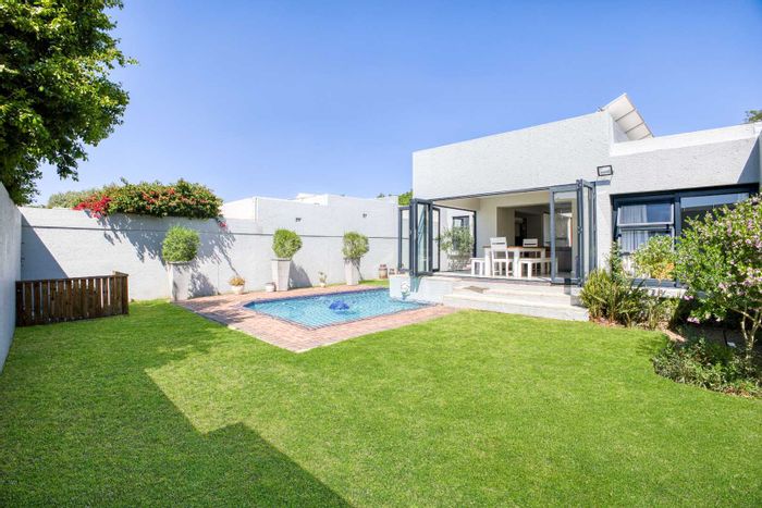 Lock-up-and-go living in sought-after Fourways Gardens Estate, with sun-filled open-plan living, enclosed stack-back patio overlooking garden and pool, solar efficiency, two-car garage; three bedrooms, two baths.
