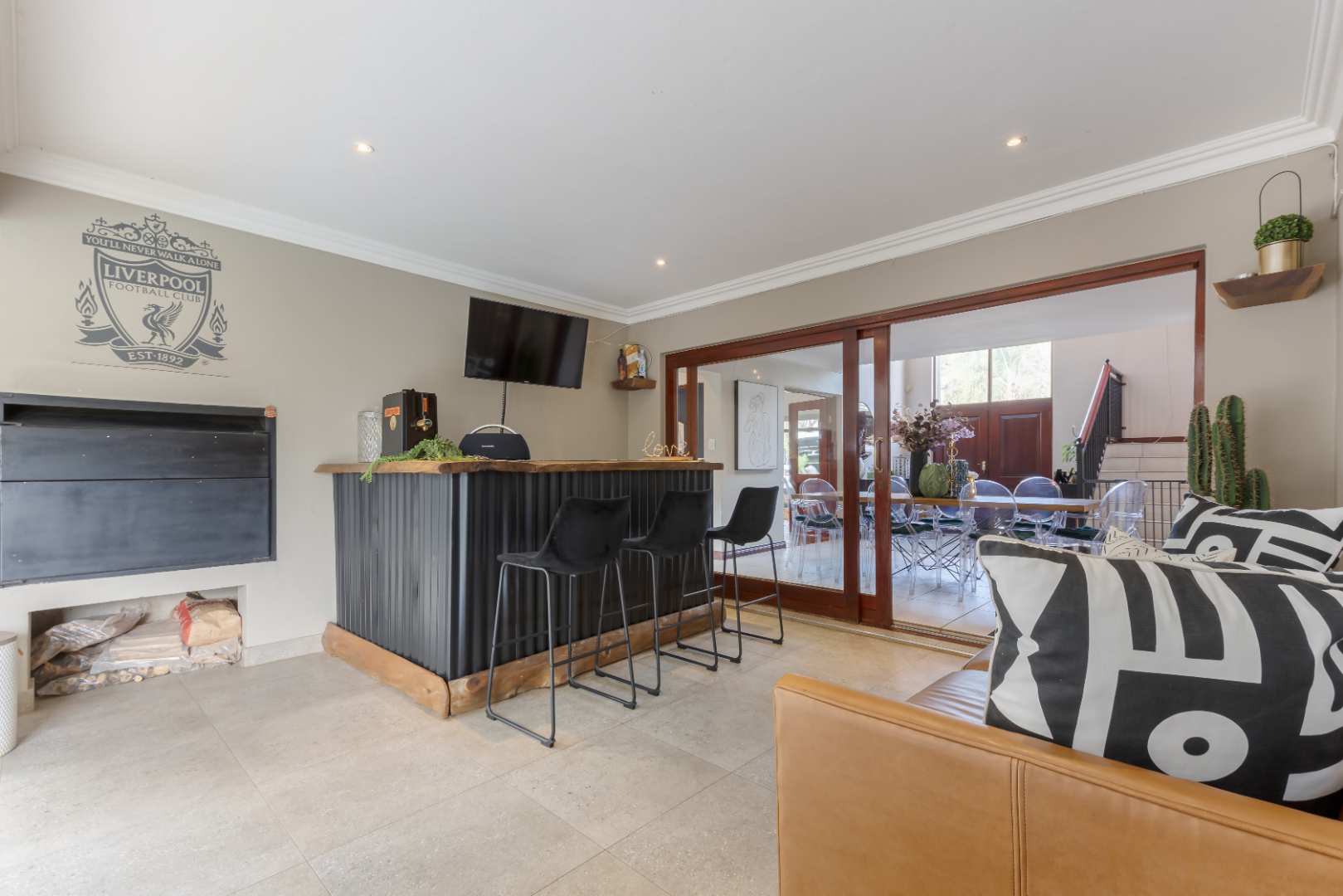 Welcoming light and bright double entrance hall flows onto an open plan family lounge with a wood burning fireplace and dining area, spilling onto an enclosed patio with a built-in wood burning braai , overlooking the tree lined manicured garden and sparkling heated swimming pool. The patio space is ideal for all year round entertaining and boasts a fitted pub area. Modern open plan kitchen with granite counter tops, breakfast nook, SMEG gas hob with extractor fan plus and electric oven, prep-bowl, massive walk-in pantry, double door fridge space, separate scullery with under counter space for 3 appliances plus ample built-in cupboard space. The downstairs floor plan has a 4th bedroom / guests suite with a bathroom with a shower, basin and loo. This floor plan is complete with an under staircase storage and a study / additional reception area.