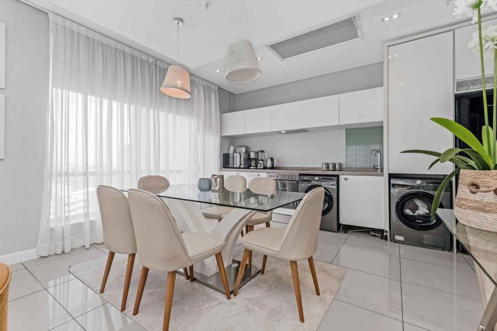 This fully furnished spacious unit offers open plan reception area which receives an abundance of sunlight and the most gorgeous views. Open plan kitchen with Caesarstone countertops boasts an eat-in kitchen with electric stove and oven with extractor fan, single door fridge, 2 under counter appliance, plus ample built-in cupboards.