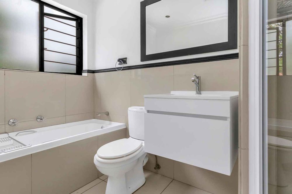 Inviting entry into this apartment lures you onto an open concept dining / lounge area, spilling onto a covered balcony, overlooking the tree top views of the gardens below. Modern open-plan fitted kitchen with Caesarstone counter tops, space for 1 under counter appliance, single door fridge space a breakfast bar, plus ample built-in cupboards space.